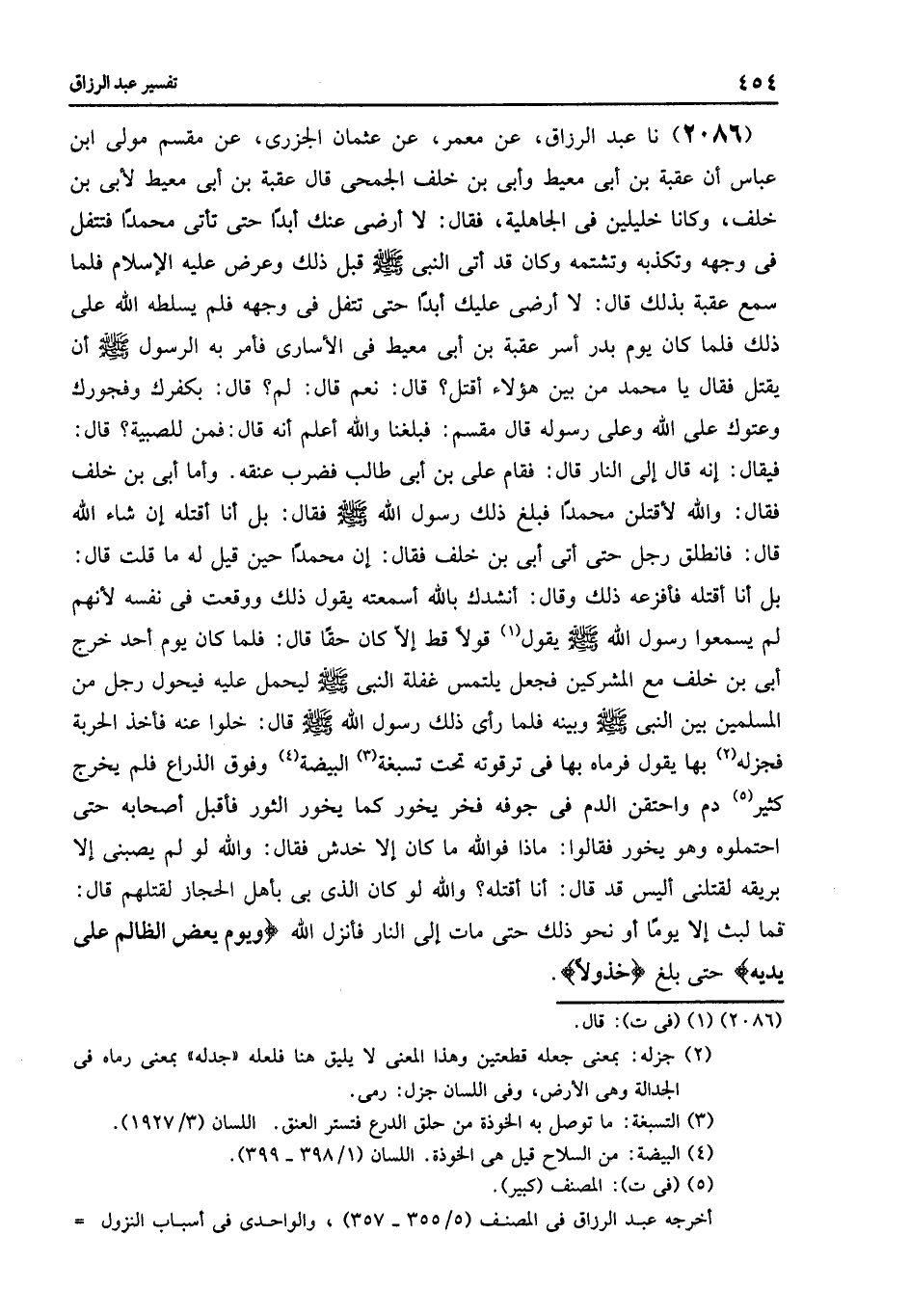 2086 - عَنْ مَعْمَرٍ , عَنْ عُثْمَانَ الْجَزَرِيِّ , عَنْ مِقْسَمٍ مَوْلَى ابْنِ عَبَّاسٍ , أَنَّ عُقْبَةَ بْنَ أَبِي مُعَيْطٍ , وَأُبَيَّ بْنَ خَلَفٍ الْجُمَحِيَّ , قَالَ عُقْبَةُ بْنُ أَبِي مُعَيْطٍ لِأُبَيِّ بْنِ خَلَفٍ وَكَانَا خَلِيلَيْنِ فِي الْجَاهِلِيَّةِ , فَقَالَ: لَا أَرْضَى عَنْكَ أَبَدًا حَتَّى تَأْتِيَ مُحَمَّدًا فَتَتْفُلَ فِي وَجْهِهِ وَتُكَذِّبَهُ وَتَشْتُمَهُ , وَكَانَ قَدْ أَتَى النَّبِيَّ صَلَّى اللهُ عَلَيْهِ وَسَلَّمَ قَبْلَ ذَلِكَ وَعَرَضَ عَلَيْهِ الْإِسْلَامَ , فَلَمَّا سَمِعَ عُقْبَةُ بِذَلِكَ , قَالَ: لَا أَرْضَى عَلَيْكَ أَبَدًا حَتَّى تَتْفُلَ فِي وَجْهِهِ , فَلَمْ يُسَلِّطْهُ اللَّهُ عَلَى ذَلِكَ , فَلَمَّا كَانَ يَوْمُ بَدْرٍ أُسِرَ عُقْبَةُ بْنُ أَبِي مُعَيْطٍ فِي الْأُسَارَى فَأَمَرَ بِهِ الرَّسُولُ صَلَّى اللهُ عَلَيْهِ وَسَلَّمَ أَنْ يُقْتَلَ , فَقَالَ: يَا مُحَمَّدُ: مِنْ بَيْنِ هَؤُلَاءِ أُقْتَلُ؟ , قَالَ: «§نَعَمْ» قَالَ: لِمَ؟ قَالَ: «بِكُفْرِكَ وَفُجُورِكَ وَعُتَوِّكَ عَلَى اللَّهِ وَعَلَى رَسُولِهِ» , قَالَ مِقْسَمٌ: فَبَلَغَنَا وَاللَّهُ أَعْلَمُ أَنَّهُ , قَالَ: «فَمَنْ لِلصِّبْيَةِ؟» , قَالَ: فَيُقَالُ: إِنَّهُ , قَالَ: «إِلَى النَّارُ» , قَالَ: فَقَامَ عَلِيُّ بْنُ أَبِي طَالِبٍ فَضَرَبَ عُنُقَهُ , وَأَمَّا أُبَيُّ بْنُ خَلَفٍ , فَقَالَ: وَاللَّهِ لَأَقْتُلَنَّ مُحَمَّدًا فَبَلَغَ ذَلِكَ رَسُولَ اللَّهِ صَلَّى اللهُ عَلَيْهِ وَسَلَّمَ فَقَالَ: «بَلْ أَنَا أَقْتُلُهُ إِنْ شَاءَ اللَّهُ» , قَالَ: فَانْطَلَقَ رَجُلٌ حَتَّى أَتَى أُبَيَّ بْنَ خَلَفٍ , فَقَالَ: إِنَّ مُحَمَّدًا حِينَ قِيلَ لَهُ مَا قُلْتَ , -[455]- قَالَ: «بَلْ أَنَا أَقْتُلُهُ» , فَأَفْزَعَهُ ذَلِكَ وَقَالَ: أَنْشُدُكَ بِاللَّهِ أَسَمِعْتَهُ يَقُولُ ذَلِكَ؟ وَوَقَعَتْ فِي نَفْسِهِ؛ لِأَنَّهُمْ لَمْ يَسْمَعُوا رَسُولَ اللَّهِ صَلَّى اللهُ عَلَيْهِ وَسَلَّمَ , يَقُولُ قَوْلًا قَطُّ إِلَّا كَانَ حَقًّا , قَالَ: فَلَمَّا كَانَ يَوْمُ أُحُدٍ خَرَجَ أُبَيُّ بْنُ خَلَفٍ مَعَ الْمُشْرِكِينَ فَجَعَلَ يَلْتَمِسُ غَفْلَةَ النَّبِيِّ صَلَّى اللهُ عَلَيْهِ وَسَلَّمَ؛ لِيَحْمِلَ عَلَيْهِ فَيَحُولَ رَجُلٌ مِنَ الْمُسْلِمِينَ بَيْنَ النَّبِيِّ صَلَّى اللهُ عَلَيْهِ وَسَلَّمَ وَبَيْنَهُ , فَلَمَّا رَأَى ذَلِكَ رَسُولُ اللَّهِ صَلَّى اللهُ عَلَيْهِ وَسَلَّمَ قَالَ: «خَلُّوا عَنْهُ» فَأَخَذَ الْحَرْبَةَ فَجَزَلَهُ بِهَا يَقُولُ فَرَمَاهُ بِهَا فِي تَرْقُوَتِهِ تَحْتَ تَسْبِغَةِ الْبَيْضَةِ , وَفَوْقَ الذِّرَاعِ فَلَمْ يَخْرُجْ كَثِيرُ دَمٍ وَاحْتَقَنَ الدَّمُ فِي جَوْفِهِ فَخَرَّ يَخُورُ كَمَا يَخُورُ الثَّوْرُ , فَأَقْبَلَ أَصْحَابُهُ حَتَّى احْتَمَلُوهُ وَهُوَ يَخُورُ فَقَالُوا: مَاذَا؟ فَوَاللَّهِ مَا كَانَ إِلَّا خَدْشٌ , فَقَالَ: وَاللَّهِ لَوْ لَمْ يُصِيبْنِي إِلَّا بِرِيقِهِ لَقَتَلَنِي , أَلَيْسَ قَدْ قَالَ: «أَنَا أَقْتُلُهُ» ؟ وَاللَّهِ لَوْ كَانَ الَّذِي بِي بِأَهْلِ الْحِجَازِ لَقَتَلَهُمْ , قَالَ: فَمَا لَبِثَ إِلَّا يَوْمًا أَوْ نَحْوَ ذَلِكَ حَتَّى مَاتَ إِلَى النَّارِ , فَأَنْزَلَ اللَّهُ: {وَيَوْمَ يَعَضُّ الظَّالِمُ عَلَى يَدَيْهِ} [الفرقان: 27] , حَتَّى بَلَغَ {خَذُولًا} [الفرقان: 29]