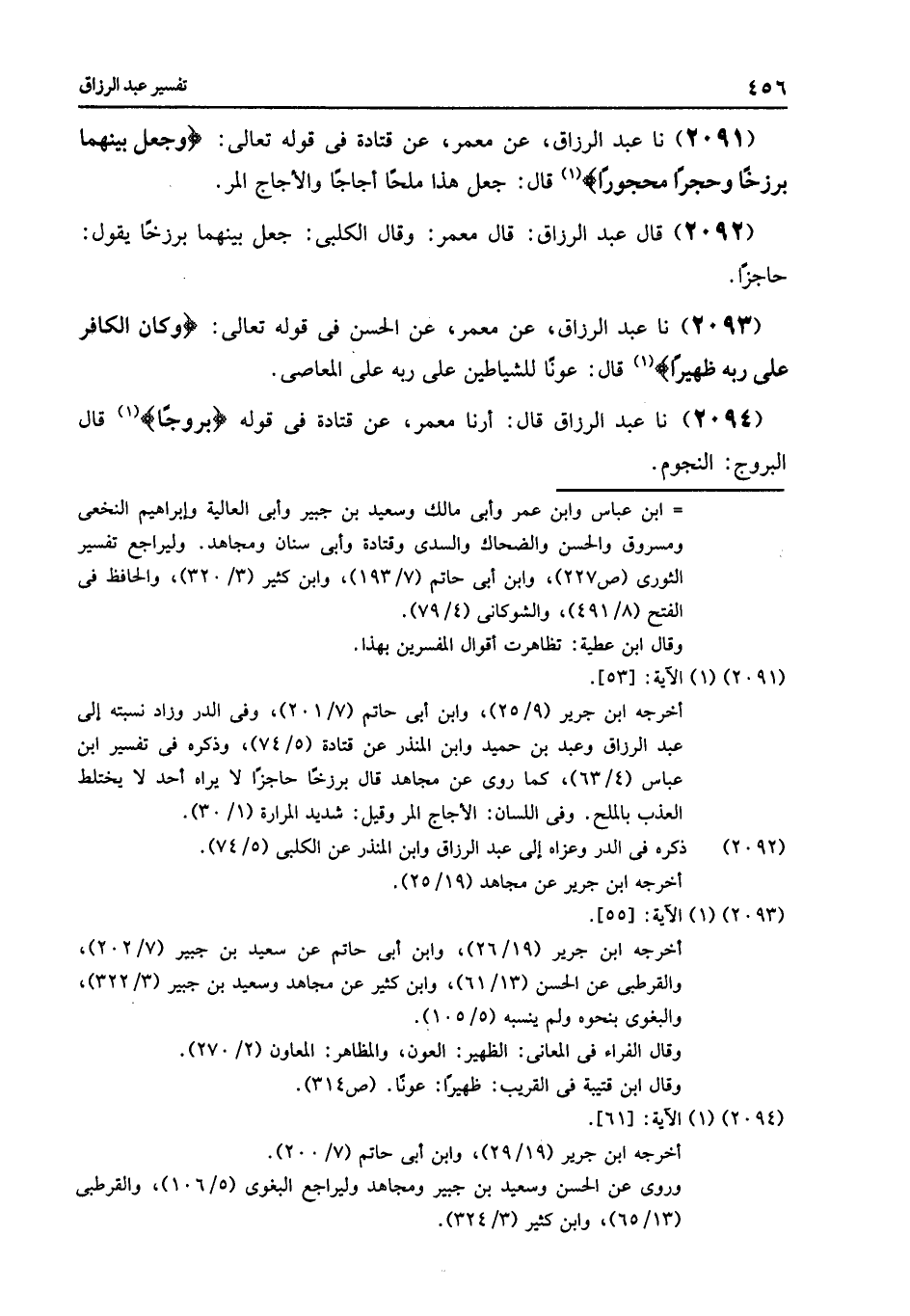 2091 - عَنْ مَعْمَرٍ , عَنْ قَتَادَةَ فِي قَوْلِهِ تَعَالَى: {§وَجَعَلَ بَيْنَهُمَا بَرْزَخًا وَحِجْرًا مَحْجُورًا} [الفرقان: 53] , قَالَ: «جَعَلَ هَذَا مِلْحًا أُجَاجًا , وَالْأُجَاجُ الْمُرُّ»