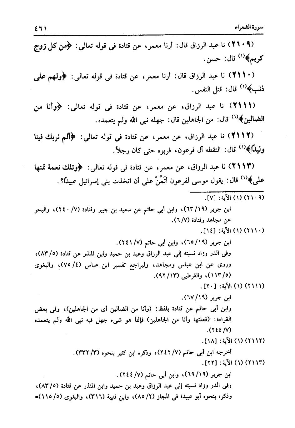 2114 - نا عَبْدُ الرَّزَّاقِ قَالَ: أرنا مَعْمَرٌ , عَنْ قَتَادَةَ , فِي قَوْلِهِ تَعَالَى: {§وَأَزْلَفْنَا ثَمَّ الْآخَرِينَ} [الشعراء: 64] , قَالَ: «هُمْ قَوْمُ فِرْعَوْنَ قَرَّبَهُمُ اللَّهُ ثُمَّ أَغْرَقَهُمْ فِي الْبَحْرِ»