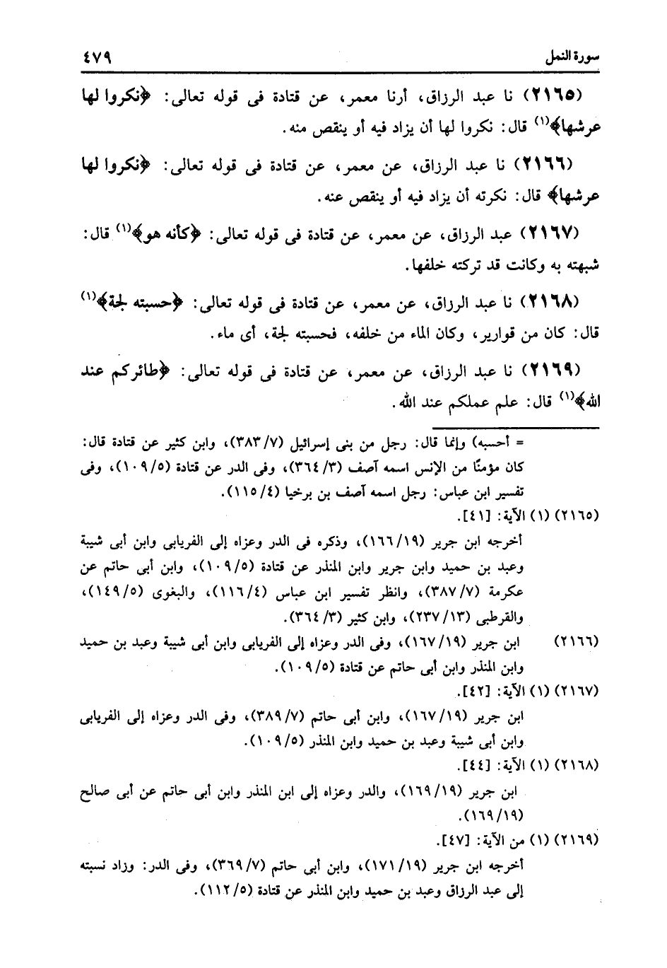 2165 - نا عَبْدُ الرَّزَّاقِ أرنا مَعْمَرٌ , عَنْ قَتَادَةَ فِي قَوْلِهِ تَعَالَى: {§نَكِّرُوا لَهَا عَرْشَهَا} [النمل: 41] , قَالَ: «نَكِّرُوا لَهَا أَنْ يُزَادَ فِيهِ أَوْ يُنْقَصَ مِنْهُ»