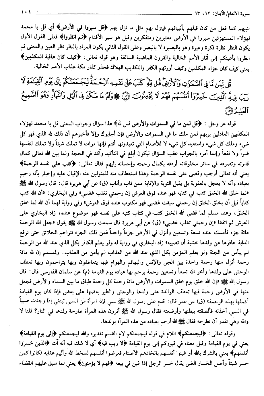 قُلْ لِمَنْ ما فِي السَّماواتِ وَالْأَرْضِ قُلْ لِلَّهِ كَتَبَ عَلى نَفْسِهِ الرَّحْمَةَ لَيَجْمَعَنَّكُمْ إِلى يَوْمِ الْقِيامَةِ لا رَيْبَ فِيهِ الَّذِينَ خَسِرُوا أَنْفُسَهُمْ فَهُمْ لا يُؤْمِنُونَ (12) وَلَهُ ما سَكَنَ فِي اللَّيْلِ وَالنَّهارِ وَهُوَ السَّمِيعُ الْعَلِيمُ (13)