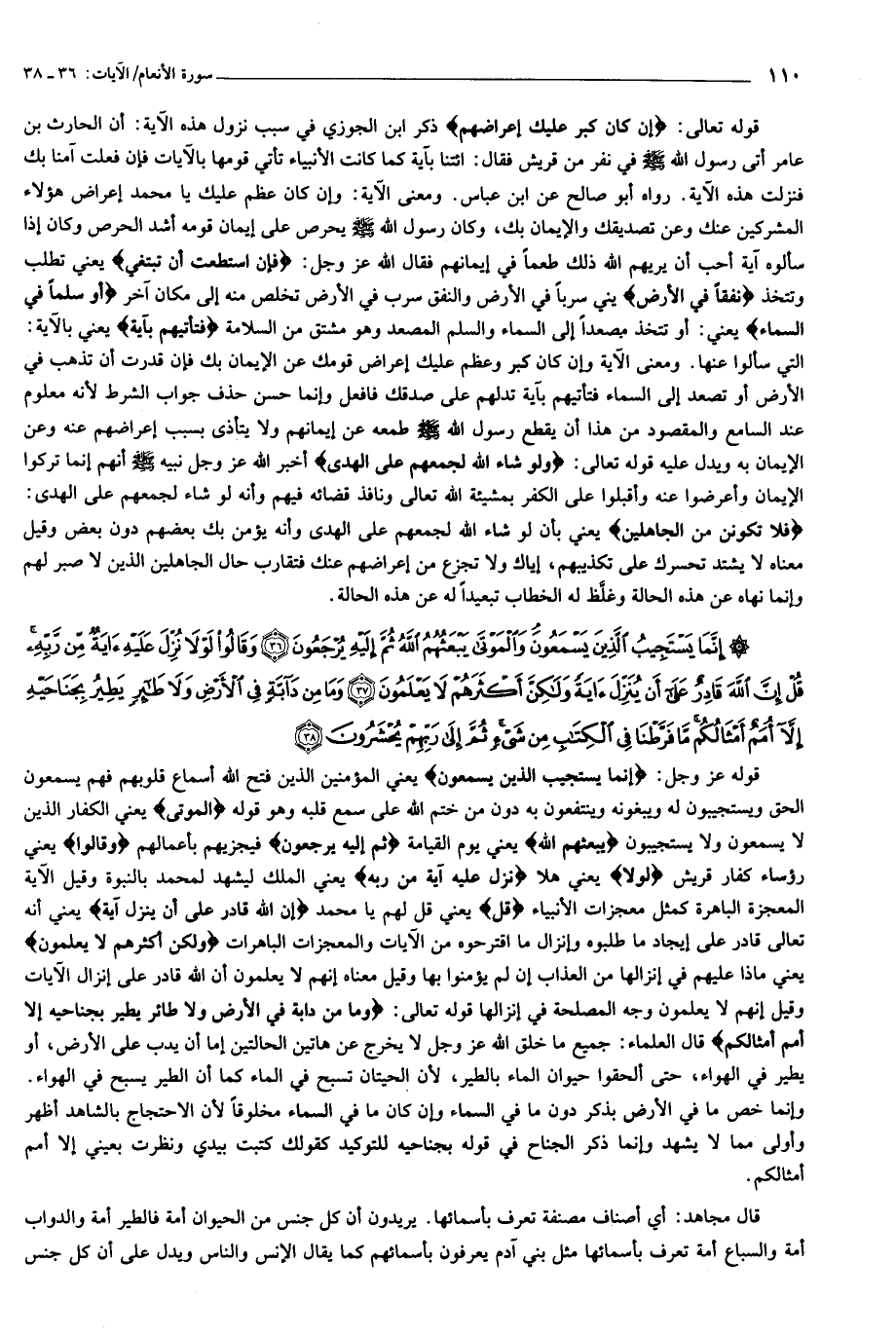 إِنَّما يَسْتَجِيبُ الَّذِينَ يَسْمَعُونَ وَالْمَوْتى يَبْعَثُهُمُ اللَّهُ ثُمَّ إِلَيْهِ يُرْجَعُونَ (36) وَقالُوا لَوْلا نُزِّلَ عَلَيْهِ آيَةٌ مِنْ رَبِّهِ قُلْ إِنَّ اللَّهَ قادِرٌ عَلى أَنْ يُنَزِّلَ آيَةً وَلكِنَّ أَكْثَرَهُمْ لا يَعْلَمُونَ (37) وَما مِنْ دَابَّةٍ فِي الْأَرْضِ وَلا طائِرٍ يَطِيرُ بِجَناحَيْهِ إِلاَّ أُمَمٌ أَمْثالُكُمْ ما فَرَّطْنا فِي الْكِتابِ مِنْ شَيْءٍ ثُمَّ إِلى رَبِّهِمْ يُحْشَرُونَ (38)