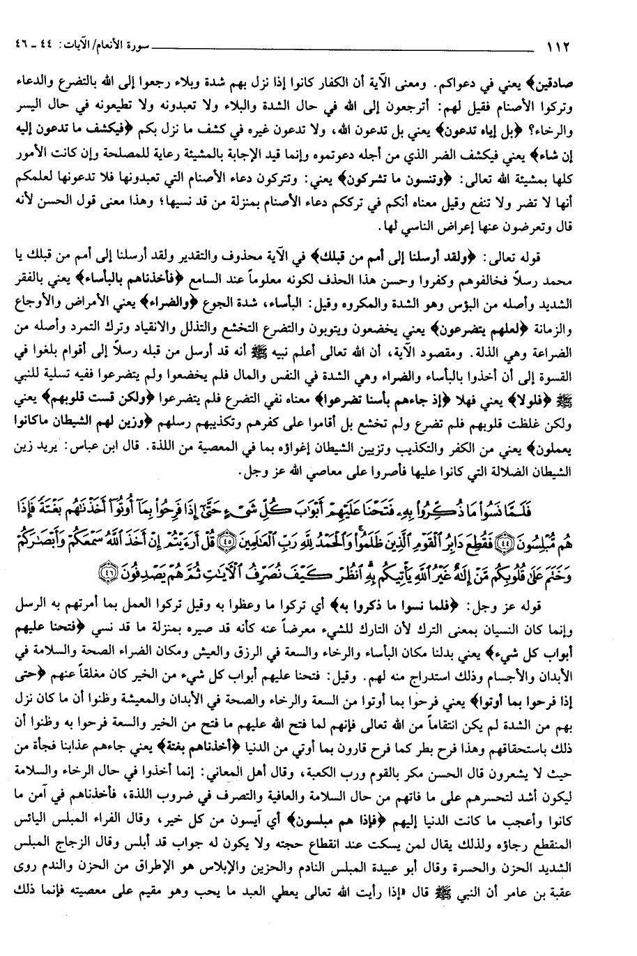 قوله تعالى: وَلَقَدْ أَرْسَلْنا إِلى أُمَمٍ مِنْ قَبْلِكَ في الآية محذوف والتقدير ولقد أرسلنا إلى أمم من قبلك يا محمد رسلا فخالفوهم وكفروا وحسن هذا الحذف لكونه معلوما عند السامع فَأَخَذْناهُمْ بِالْبَأْساءِ يعني بالفقر الشديد وأصله من البؤس وهو الشدة والمكروه وقيل: البأساء، شدة الجوع وَالضَّرَّاءِ يعني الأمراض والأوجاع والزمانة لَعَلَّهُمْ يَتَضَرَّعُونَ يعني يخضعون ويتوبون والتضرع التخشع والتذلل والانقياد وترك التمرد وأصله من الضراعة وهي الذلة. ومقصود الآية، أن الله تعالى أعلم نبيه صلى الله عليه وسلم أنه قد أرسل من قبله رسلا إلى أقوام بلغوا في القسوة إلى أن أخذوا بالبأساء والضراء وهي الشدة في النفس والمال فلم يخضعوا ولم يتضرعوا ففيه تسلية للنبي صلى الله عليه وسلم فَلَوْلا يعني فهلا إِذْ جاءَهُمْ بَأْسُنا تَضَرَّعُوا معناه نفي التضرع فلم يتضرعوا وَلكِنْ قَسَتْ قُلُوبُهُمْ يعني ولكن غلظت قلوبهم فلم تضرع ولم تخشع بل أقاموا على كفرهم وتكذيبهم رسلهم وَزَيَّنَ لَهُمُ الشَّيْطانُ ما كانُوا يَعْمَلُونَ يعني من الكفر والتكذيب وتزيين الشيطان إغواؤه بما في المعصية من اللذة. قال ابن عباس: يريد زين الشيطان الضلالة التي كانوا عليها فأصروا على معاصي الله عز وجل.