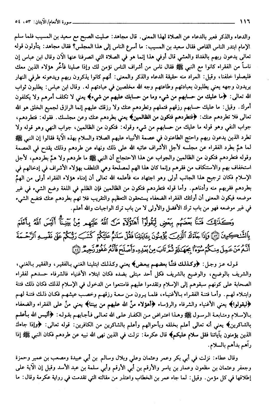 وَكَذلِكَ فَتَنَّا بَعْضَهُمْ بِبَعْضٍ لِيَقُولُوا أَهؤُلاءِ مَنَّ اللَّهُ عَلَيْهِمْ مِنْ بَيْنِنا أَلَيْسَ اللَّهُ بِأَعْلَمَ بِالشَّاكِرِينَ (53) وَإِذا جاءَكَ الَّذِينَ يُؤْمِنُونَ بِآياتِنا فَقُلْ سَلامٌ عَلَيْكُمْ كَتَبَ رَبُّكُمْ عَلى نَفْسِهِ الرَّحْمَةَ أَنَّهُ مَنْ عَمِلَ مِنْكُمْ سُوءاً بِجَهالَةٍ ثُمَّ تابَ مِنْ بَعْدِهِ وَأَصْلَحَ فَأَنَّهُ غَفُورٌ رَحِيمٌ (54)