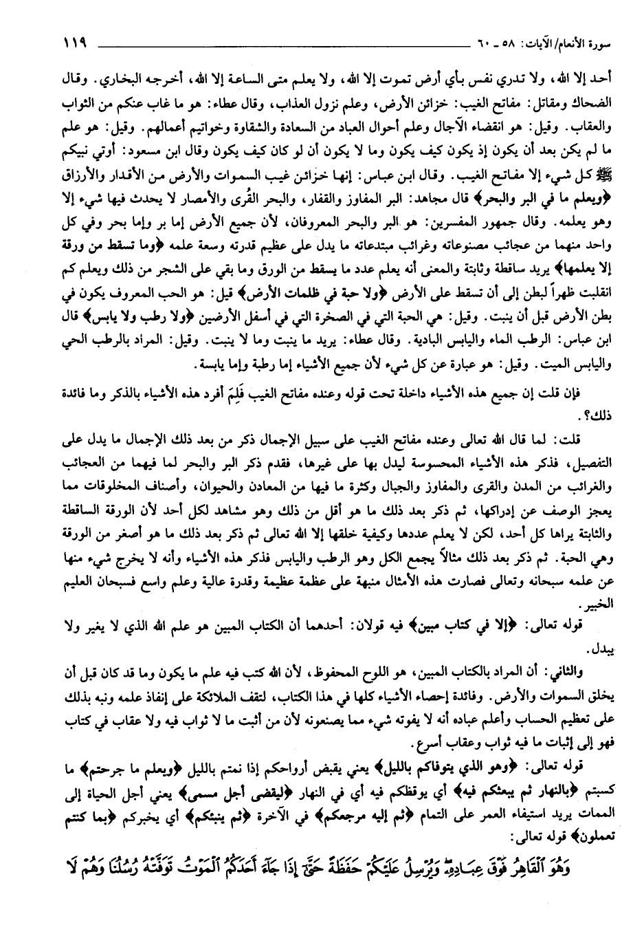 أحد إلا الله، ولا تدري نفس بأي أرض تموت إلا الله، ولا يعلم متى الساعة إلا الله، أخرجه البخاري. وقال الضحاك ومقاتل: مفاتح الغيب: خزائن الأرض، وعلم نزول العذاب، وقال عطاء: هو ما غاب عنكم من الثواب والعقاب. وقيل: هو انقضاء الآجال وعلم أحوال العباد من السعادة والشقاوة وخواتيم أعمالهم. وقيل: هو علم ما لم يكن بعد أن يكون إذ يكون كيف يكون وما لا يكون أن لو كان كيف يكون وقال ابن مسعود: أوتي نبيكم صلى الله عليه وسلم كل شيء إلا مفاتح الغيب. وقال ابن عباس: إنها خزائن غيب السموات والأرض من الأقدار والأرزاق وَيَعْلَمُ ما فِي الْبَرِّ وَالْبَحْرِ قال مجاهد: البر المفاوز والقفار، والبحر القرى والأمصار لا يحدث فيها شيء إلا وهو يعلمه. وقال جمهور المفسرين: هو البر والبحر المعروفان، لأن جميع الأرض إما بر وإما بحر وفي كل واحد منهما من عجائب مصنوعاته وغرائب مبتدعاته ما يدل على عظيم قدرته وسعة علمه وَما تَسْقُطُ مِنْ وَرَقَةٍ إِلَّا يَعْلَمُها يريد ساقطة وثابتة والمعنى أنه يعلم عدد ما يسقط من الورق وما بقي على الشجر من ذلك ويعلم كم انقلبت ظهرا لبطن إلى أن تسقط على الأرض وَلا حَبَّةٍ فِي ظُلُماتِ الْأَرْضِ قيل: هو الحب المعروف يكون في بطن الأرض قبل أن ينبت. وقيل: هي الحبة التي في الصخرة التي في أسفل الأرضين وَلا رَطْبٍ وَلا يابِسٍ قال ابن عباس: الرطب الماء واليابس البادية. وقال عطاء: يريد ما ينبت وما لا ينبت. وقيل: المراد بالرطب الحي واليابس الميت. وقيل: هو عبارة عن كل شيء لأن جميع الأشياء إما رطبة وإما يابسة.