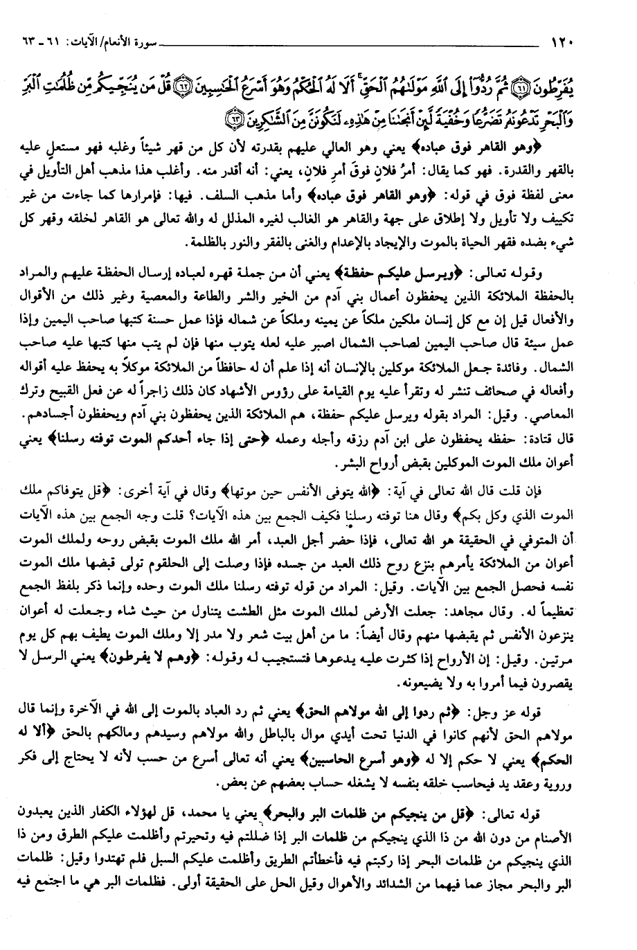 وَهُوَ الْقاهِرُ فَوْقَ عِبادِهِ وَيُرْسِلُ عَلَيْكُمْ حَفَظَةً حَتَّى إِذا جاءَ أَحَدَكُمُ الْمَوْتُ تَوَفَّتْهُ رُسُلُنا وَهُمْ لا يُفَرِّطُونَ (61) ثُمَّ رُدُّوا إِلَى اللَّهِ مَوْلاهُمُ الْحَقِّ أَلا لَهُ الْحُكْمُ وَهُوَ أَسْرَعُ الْحاسِبِينَ (62) قُلْ مَنْ يُنَجِّيكُمْ مِنْ ظُلُماتِ الْبَرِّ وَالْبَحْرِ تَدْعُونَهُ تَضَرُّعاً وَخُفْيَةً لَئِنْ أَنْجانا مِنْ هذِهِ لَنَكُونَنَّ مِنَ الشَّاكِرِينَ (63)