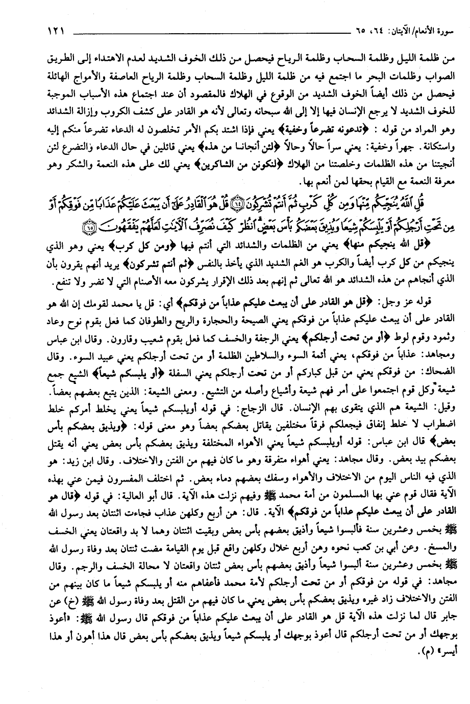 قُلِ اللَّهُ يُنَجِّيكُمْ مِنْها وَمِنْ كُلِّ كَرْبٍ ثُمَّ أَنْتُمْ تُشْرِكُونَ (64) قُلْ هُوَ الْقادِرُ عَلى أَنْ يَبْعَثَ عَلَيْكُمْ عَذاباً مِنْ فَوْقِكُمْ أَوْ مِنْ تَحْتِ أَرْجُلِكُمْ أَوْ يَلْبِسَكُمْ شِيَعاً وَيُذِيقَ بَعْضَكُمْ بَأْسَ بَعْضٍ انْظُرْ كَيْفَ نُصَرِّفُ الْآياتِ لَعَلَّهُمْ يَفْقَهُونَ (65)