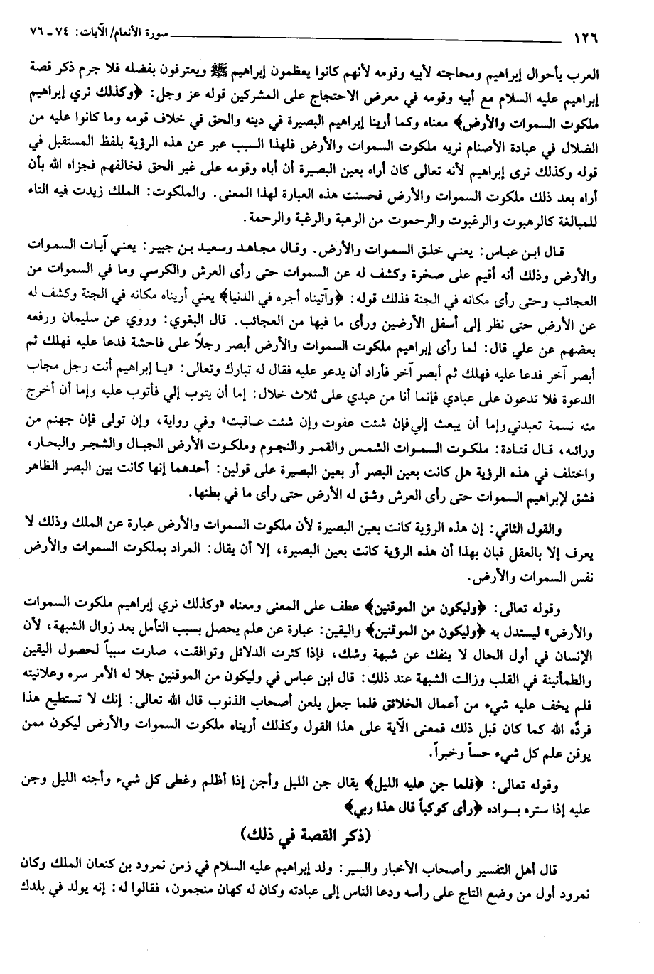 العرب بأحوال إبراهيم ومحاجته لأبيه وقومه لأنهم كانوا يعظمون إبراهيم صلى الله عليه وسلم ويعترفون بفضله فلا جرم ذكر قصة إبراهيم عليه السلام مع أبيه وقومه في معرض الاحتجاج على المشركين قوله عز وجل: وَكَذلِكَ نُرِي إِبْراهِيمَ مَلَكُوتَ السَّماواتِ وَالْأَرْضِ معناه وكما أرينا إبراهيم البصيرة في دينه والحق في خلاف قومه وما كانوا عليه من الضلال في عبادة الأصنام نريه ملكوت السموات والأرض فلهذا السبب عبر عن هذه الرؤية بلفظ المستقبل في قوله وكذلك نرى إبراهيم لأنه تعالى كان أراه بعين البصيرة أن أباه وقومه على غير الحق فخالفهم فجزاه الله بأن أراه بعد ذلك ملكوت السموات والأرض فحسنت هذه العبارة لهذا المعنى. والملكوت: الملك زيدت فيه التاء للمبالغة كالرهبوت والرغبوت والرحموت من الرهبة والرغبة والرحمة.