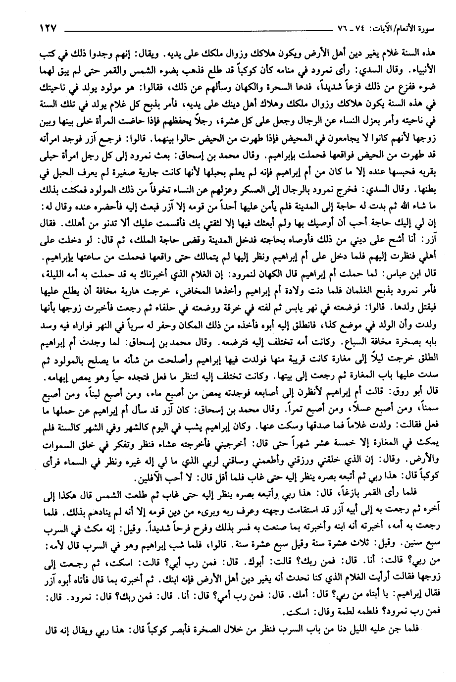 فلما رأى القمر بازغا، قال: هذا ربي وأتبعه بصره ينظر إليه حتى غاب ثم طلعت الشمس قال هكذا إلى آخره ثم رجعت به إلى أبيه آزر قد استقامت وجهته وعرف ربه وبرئ من دين قومه إلا أنه لم ينادهم بذلك. فلما رجعت به أمه، أخبرته أنه ابنه وأخبرته بما صنعت به فسر بذلك وفرح فرحا شديدا. وقيل: إنه مكث في السرب سبع سنين. وقيل: ثلاث عشرة سنة وقيل سبع عشرة سنة. قالوا، فلما شب إبراهيم وهو في السرب قال لأمه: