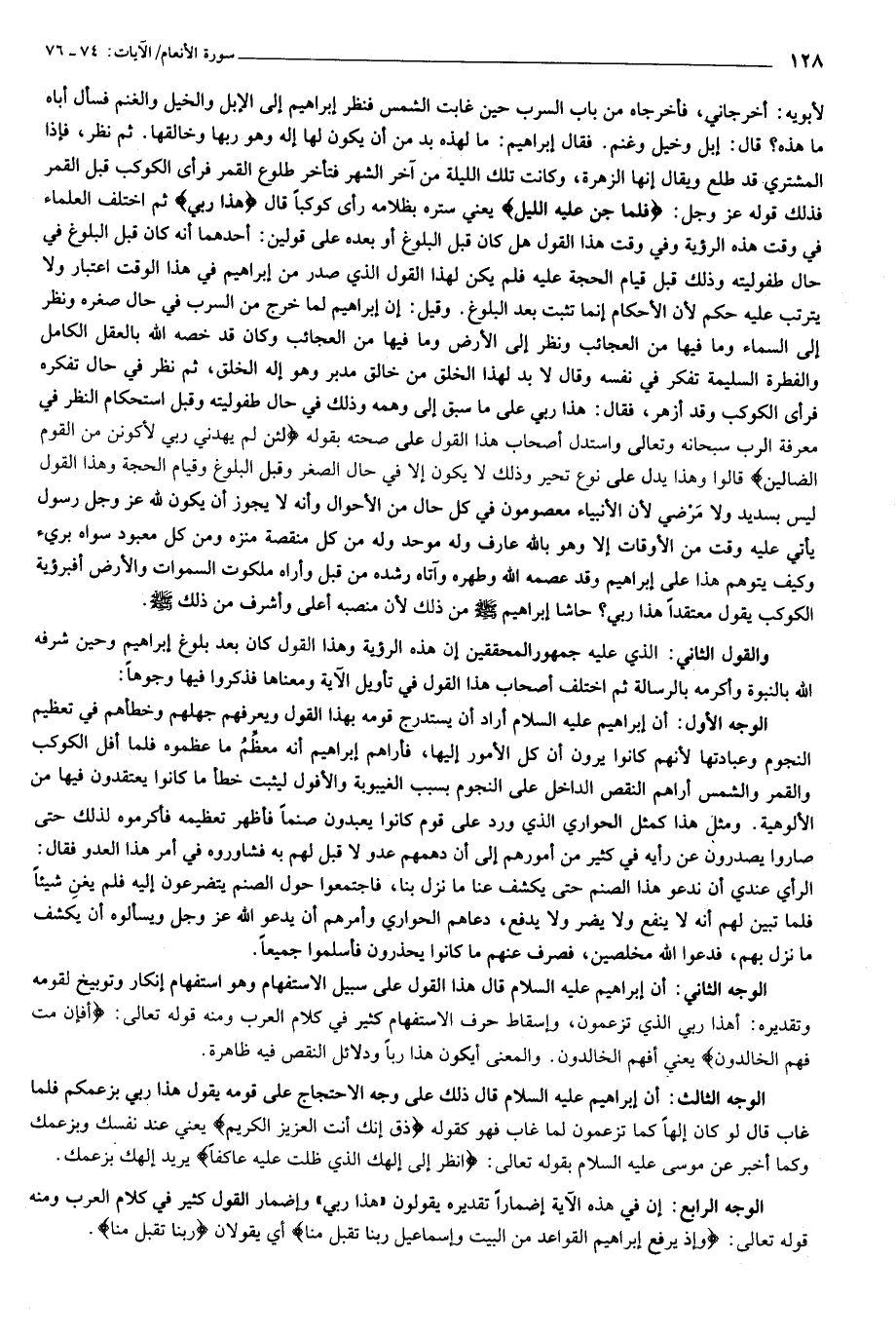 لأبويه: أخرجاني، فأخرجاه من باب السرب حين غابت الشمس فنظر إبراهيم إلى الإبل والخيل والغنم فسأل أباه ما هذه؟ قال: إبل وخيل وغنم. فقال إبراهيم: ما لهذه بد من أن يكون لها إله وهو ربها وخالقها. ثم نظر، فإذا المشتري قد طلع ويقال إنها الزهرة، وكانت تلك الليلة من آخر الشهر فتأخر طلوع القمر فرأى الكوكب قبل القمر فذلك قوله عز وجل: فَلَمَّا جَنَّ عَلَيْهِ اللَّيْلُ يعني ستره بظلامه رأى كوكبا قال هذا رَبِّي ثم اختلف العلماء في وقت هذه الرؤية وفي وقت هذا القول هل كان قبل البلوغ أو بعده على قولين: أحدهما أنه كان قبل البلوغ في حال طفوليته وذلك قبل قيام الحجة عليه فلم يكن لهذا القول الذي صدر من إبراهيم في هذا الوقت اعتبار ولا يترتب عليه حكم لأن الأحكام إنما تثبت بعد البلوغ. وقيل: إن إبراهيم لما خرج من السرب في حال صغره ونظر إلى السماء وما فيها من العجائب ونظر إلى الأرض وما فيها من العجائب وكان قد خصه الله بالعقل الكامل والفطرة السليمة تفكر في نفسه وقال لا بد لهذا الخلق من خالق مدبر وهو إله الخلق، ثم نظر في حال تفكره فرأى الكوكب وقد أزهر، فقال: هذا ربي على ما سبق إلى وهمه وذلك في حال طفوليته وقبل استحكام النظر في معرفة الرب سبحانه وتعالى واستدل أصحاب هذا القول على صحته بقوله لَئِنْ لَمْ يَهْدِنِي رَبِّي لَأَكُونَنَّ مِنَ الْقَوْمِ الضَّالِّينَ قالوا وهذا يدل على نوع تحير وذلك لا يكون إلا في حال الصغر وقبل البلوغ وقيام الحجة وهذا القول ليس بسديد ولا مرضي لأن الأنبياء معصومون في كل حال من الأحوال وأنه لا يجوز أن يكون لله عز وجل رسول يأتي عليه وقت من الأوقات إلا وهو بالله عارف وله موحد وله من كل منقصة منزه ومن كل معبود سواه بريء وكيف يتوهم هذا على إبراهيم وقد عصمه الله وطهره وآتاه رشده من قبل وأراه ملكوت السموات والأرض أفبرؤية الكوكب يقول معتقدا هذا ربي؟ حاشا إبراهيم صلى الله عليه وسلم من ذلك لأن منصبه أعلى وأشرف من ذلك صلى الله عليه وسلم.