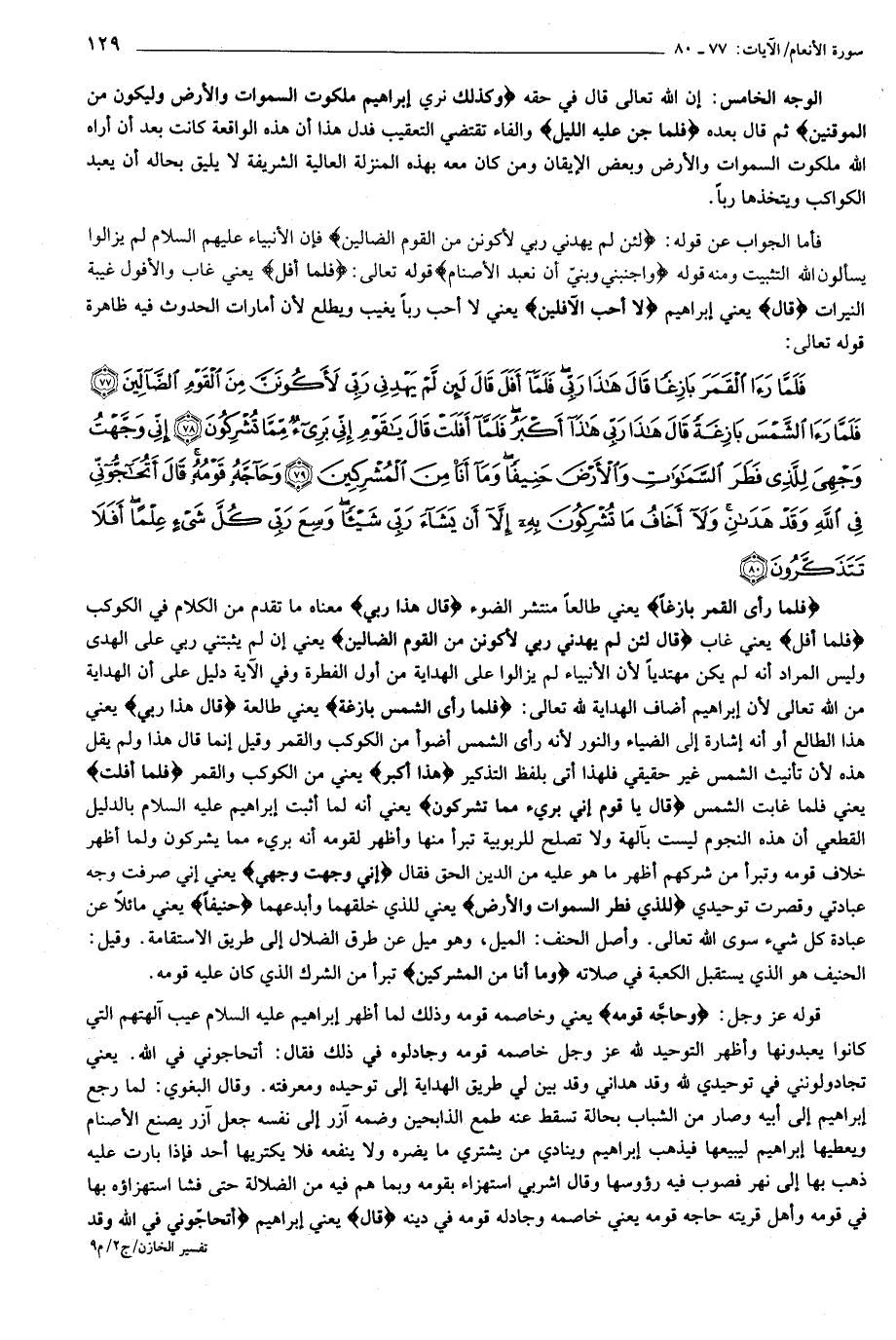 فَلَمَّا رَأَى الْقَمَرَ بازِغاً قالَ هذا رَبِّي فَلَمَّا أَفَلَ قالَ لَئِنْ لَمْ يَهْدِنِي رَبِّي لَأَكُونَنَّ مِنَ الْقَوْمِ الضَّالِّينَ (77) فَلَمَّا رَأَى الشَّمْسَ بازِغَةً قالَ هذا رَبِّي هذا أَكْبَرُ فَلَمَّا أَفَلَتْ قالَ يا قَوْمِ إِنِّي بَرِيءٌ مِمَّا تُشْرِكُونَ (78) إِنِّي وَجَّهْتُ وَجْهِيَ لِلَّذِي فَطَرَ السَّماواتِ وَالْأَرْضَ حَنِيفاً وَما أَنَا مِنَ الْمُشْرِكِينَ (79) وَحاجَّهُ قَوْمُهُ قالَ أَتُحاجُّونِّي فِي اللَّهِ وَقَدْ هَدانِ وَلا أَخافُ ما تُشْرِكُونَ بِهِ إِلاَّ أَنْ يَشاءَ رَبِّي شَيْئاً وَسِعَ رَبِّي كُلَّ شَيْءٍ عِلْماً أَفَلا تَتَذَكَّرُونَ (80)