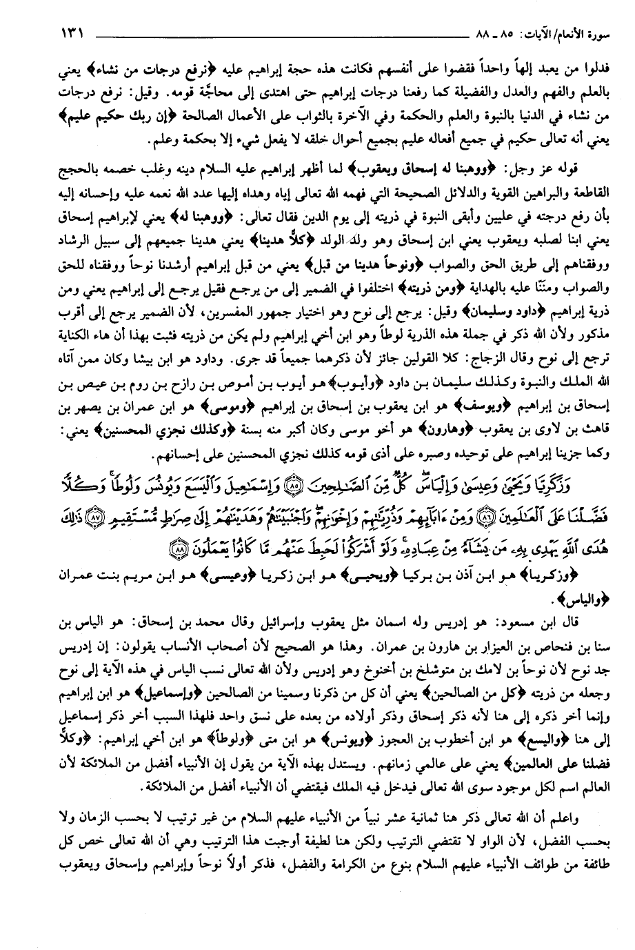 وَزَكَرِيَّا وَيَحْيى وَعِيسى وَإِلْياسَ كُلٌّ مِنَ الصَّالِحِينَ (85) وَإِسْماعِيلَ وَالْيَسَعَ وَيُونُسَ وَلُوطاً وَكلاًّ فَضَّلْنا عَلَى الْعالَمِينَ (86) وَمِنْ آبائِهِمْ وَذُرِّيَّاتِهِمْ وَإِخْوانِهِمْ وَاجْتَبَيْناهُمْ وَهَدَيْناهُمْ إِلى صِراطٍ مُسْتَقِيمٍ (87) ذلِكَ هُدَى اللَّهِ يَهْدِي بِهِ مَنْ يَشاءُ مِنْ عِبادِهِ وَلَوْ أَشْرَكُوا لَحَبِطَ عَنْهُمْ ما كانُوا يَعْمَلُونَ (88)