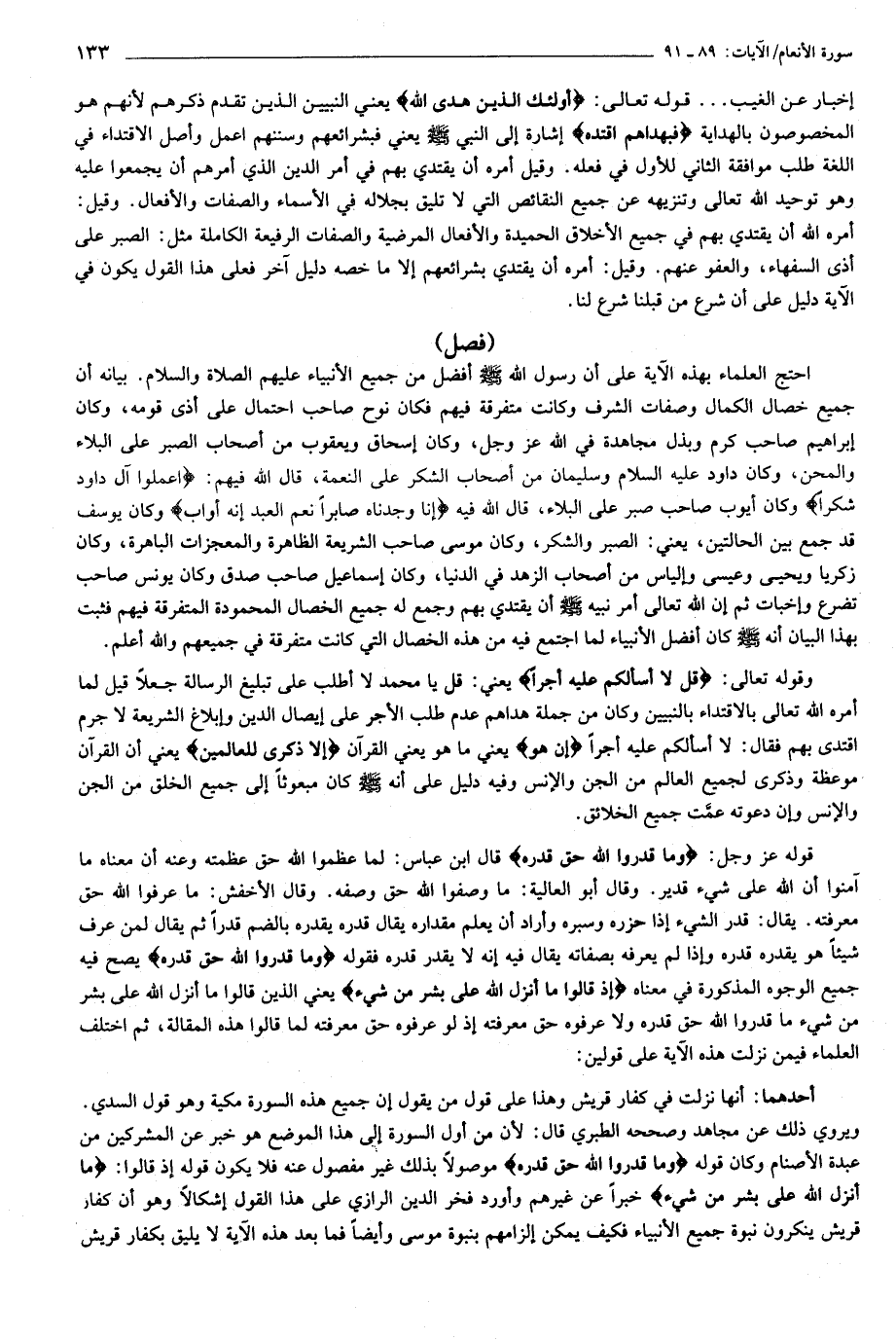 ((فصل)) احتج العلماء بهذه الآية على أن رسول الله صلى الله عليه وسلم أفضل من جميع الأنبياء عليهم الصلاة والسلام. بيانه أن جميع خصال الكمال وصفات الشرف وكانت متفرقة فيهم فكان نوح صاحب احتمال على أذى قومه، وكان إبراهيم صاحب كرم وبذل مجاهدة في الله عز وجل، وكان إسحاق ويعقوب من أصحاب الصبر على البلاء والمحن، وكان داود عليه السلام سليمان من أصحاب الشكر على النعمة، قال الله فيهم: اعْمَلُوا آلَ داوُدَ شُكْراً وكان أيوب صاحب صبر على البلاء، قال الله فيه إِنَّا وَجَدْناهُ صابِراً نِعْمَ الْعَبْدُ إِنَّهُ أَوَّابٌ وكان يوسف قد جمع بين الحالتين، يعني: الصبر والشكر، وكان موسى صاحب الشريعة الظاهرة والمعجزات الباهرة، وكان زكريا ويحيى وعيسى وإلياس من أصحاب الزهد في الدنيا، وكان إسماعيل صاحب صدق وكان يونس صاحب تضرع وإخبات ثم إن الله تعالى أمر نبيه صلى الله عليه وسلم أن يقتدي بهم وجمع له جميع الخصال المحمودة المتفرقة فيهم فثبت بهذا البيان أنه صلى الله عليه وسلم كان أفضل الأنبياء لما اجتمع فيه من هذه الخصال التي كانت متفرقة في جميعهم والله أعلم.