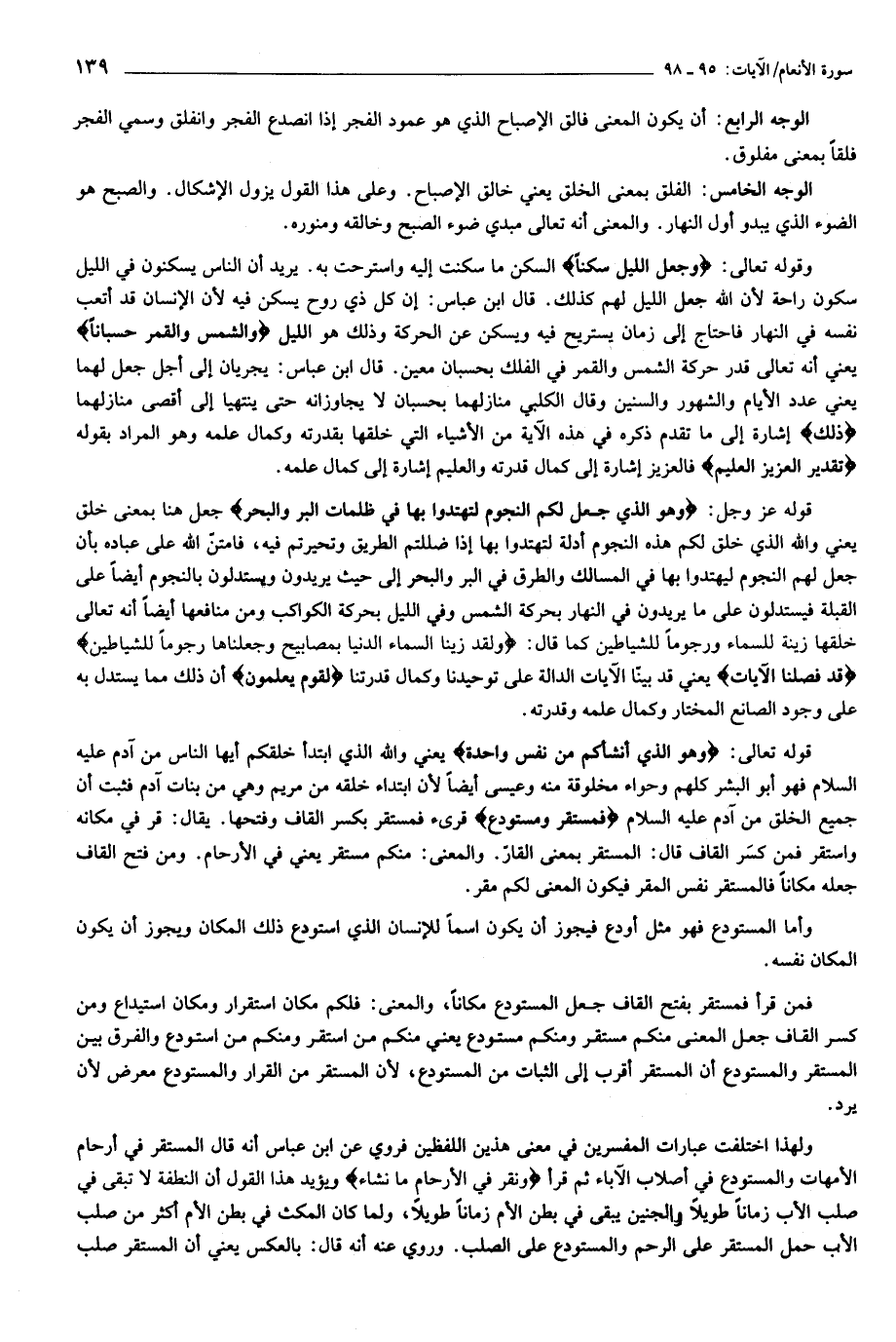 ولهذا اختلفت عبارات المفسرين في معنى هذين اللفظين فروي عن ابن عباس أنه قال المستقر في أرحام الأمهات والمستودع في أصلاب الآباء ثم قرأ وَنُقِرُّ فِي الْأَرْحامِ ما نَشاءُ ويؤيد هذا القول أن النطفة لا تبقى في صلب الأب زمانا طويلا والجنين يبقى في بطن الأم زمانا طويلا، ولما كان المكث في بطن الأم أكثر من صلب الأب حمل المستقر على الرحم والمستودع على الصلب. وروي عنه أنه قال: بالعكس يعني أن المستقر صلب
