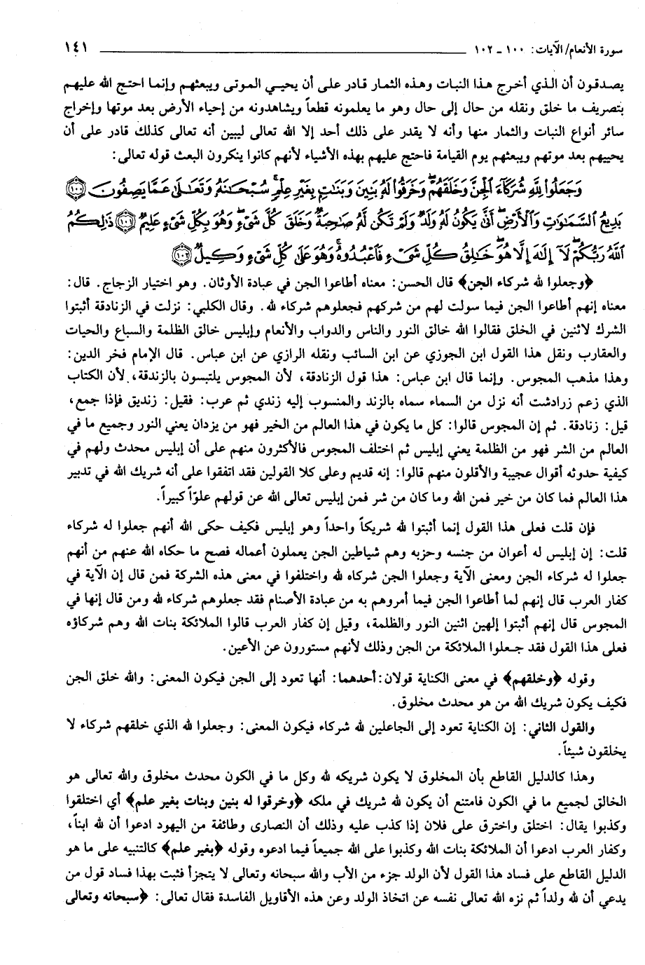 وَجَعَلُوا لِلَّهِ شُرَكاءَ الْجِنَّ وَخَلَقَهُمْ وَخَرَقُوا لَهُ بَنِينَ وَبَناتٍ بِغَيْرِ عِلْمٍ سُبْحانَهُ وَتَعالى عَمَّا يَصِفُونَ (100) بَدِيعُ السَّماواتِ وَالْأَرْضِ أَنَّى يَكُونُ لَهُ وَلَدٌ وَلَمْ تَكُنْ لَهُ صاحِبَةٌ وَخَلَقَ كُلَّ شَيْءٍ وَهُوَ بِكُلِّ شَيْءٍ عَلِيمٌ (101) ذلِكُمُ اللَّهُ رَبُّكُمْ لا إِلهَ إِلاَّ هُوَ خالِقُ كُلِّ شَيْءٍ فَاعْبُدُوهُ وَهُوَ عَلى كُلِّ شَيْءٍ وَكِيلٌ (102)