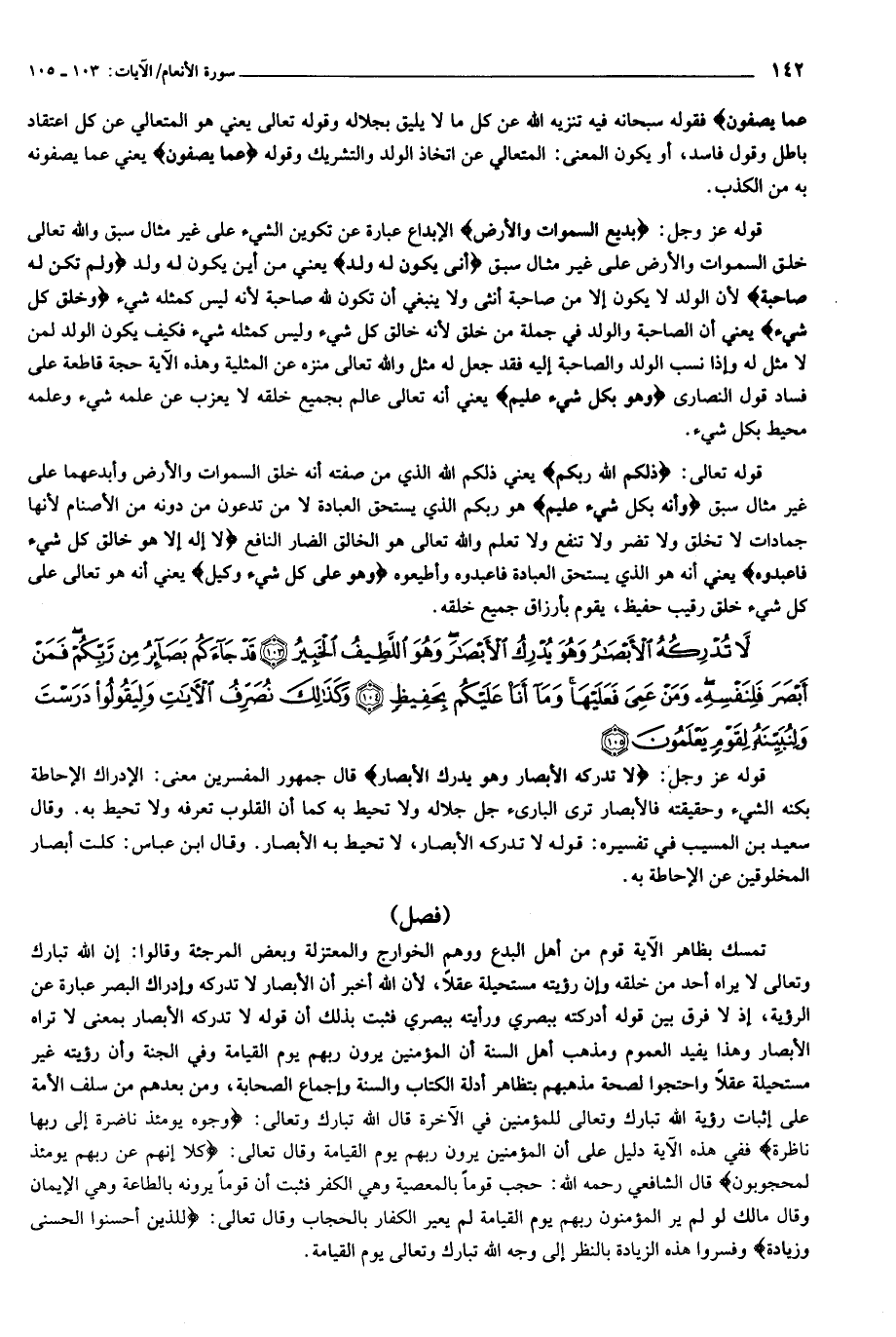 ((فصل)) تمسك بظاهر الآية قوم من أهل البدع ووهم الخوارج والمعتزلة وبعض المرجئة وقالوا: إن الله تبارك وتعالى لا يراه أحد من خلقه وإن رؤيته مستحيلة عقلا، لأن الله أخبر أن الأبصار لا تدركه وإدراك البصر عبارة عن الرؤية، إذ لا فرق بين قوله أدركته ببصري ورأيته ببصري فثبت بذلك أن قوله لا تدركه الأبصار بمعنى لا تراه الأبصار وهذا يفيد العموم ومذهب أهل السنة أن المؤمنين يرون ربهم يوم القيامة وفي الجنة وأن رؤيته غير مستحيلة عقلا واحتجوا لصحة مذهبهم بتظاهر أدلة الكتاب والسنة وإجماع الصحابة، ومن بعدهم من سلف الأمة على إثبات رؤية الله تبارك وتعالى للمؤمنين في الآخرة قال الله تبارك وتعالى: وُجُوهٌ يَوْمَئِذٍ ناضِرَةٌ إِلى رَبِّها ناظِرَةٌ ففي هذه الآية دليل على أن المؤمنين يرون ربهم يوم القيامة وقال تعالى: كَلَّا إِنَّهُمْ عَنْ رَبِّهِمْ يَوْمَئِذٍ لَمَحْجُوبُونَ قال الشافعي رحمه الله: حجب قوما بالمعصية وهي الكفر فثبت أن قوما يرونه بالطاعة وهي الإيمان وقال مالك لو لم ير المؤمنون ربهم يوم القيامة لم يعير الكفار بالحجاب وقال تعالى: لِلَّذِينَ أَحْسَنُوا الْحُسْنى وَزِيادَةٌ وفسروا هذه الزيادة بالنظر إلى وجه الله تبارك وتعالى يوم القيامة.