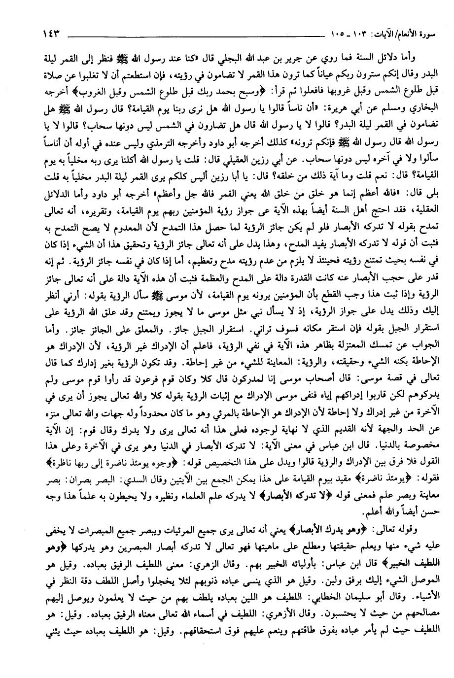 وأما دلائل السنة فما روي عن جرير بن عبد الله البجلي قال «كنا عند رسول الله صلى الله عليه وسلم فنظر إلى القمر ليلة البدر وقال إنكم سترون ربكم عيانا كما ترون هذا القمر لا تضامون في رؤيته، فإن استطعتم أن لا تغلبوا عن صلاة قبل طلوع الشمس وقبل غروبها فافعلوا ثم قرأ: وَسَبِّحْ بِحَمْدِ رَبِّكَ قَبْلَ طُلُوعِ الشَّمْسِ وَقَبْلَ الْغُرُوبِ أخرجه البخاري ومسلم عن أبي هريرة: «أن ناسا قالوا يا رسول الله هل نرى ربنا يوم القيامة؟ قال رسول الله صلى الله عليه وسلم هل تضامون في القمر ليلة البدر؟ قالوا لا يا رسول الله قال هل تضارون في الشمس ليس دونها سحاب؟ قالوا لا يا رسول الله قال رسول الله صلى الله عليه وسلم فإنكم ترونه» كذلك أخرجه أبو داود وأخرجه الترمذي وليس عنده في أوله أن أناسا سألوا ولا في آخره ليس دونها سحاب. عن أبي رزين العقيلي قال: قلت يا رسول الله أكلنا يرى ربه مخليا به يوم القيامة؟ قال: نعم قلت وما آية ذلك من خلقه؟ قال: يا أبا رزين أليس كلكم يرى القمر ليلة البدر مخليا به قلت بلى قال: «فالله أعظم إنما هو خلق من خلق الله يعني القمر فالله جل وأعظم» أخرجه أبو داود وأما الدلائل العقلية، فقد احتج أهل السنة أيضا بهذه الآية على جواز رؤية المؤمنين ربهم يوم القيامة، وتقريره، أنه تعالى تمدح بقوله لا تدركه الأبصار فلو لم يكن جائز الرؤية لما حصل هذا التمدح لأن المعدوم لا يصح التمدح به فثبت أن قوله لا تدركه الأبصار يفيد المدح، وهذا يدل على أنه تعالى جائز الرؤية وتحقيق هذا أن الشيء إذا كان في نفسه بحيث تمتنع رؤيته فحينئذ لا يلزم من عدم رؤيته مدح وتعظيم، أما إذا كان في نفسه جائز الرؤية. ثم إنه قدر على حجب الأبصار عنه كانت القدرة دالة على المدح والعظمة فثبت أن هذه الآية دالة على أنه تعالى جائز الرؤية وإذا ثبت هذا وجب القطع بأن المؤمنين يرونه يوم القيامة، لأن موسى صلى الله عليه وسلم سأل الرؤية بقوله: أرني أنظر إليك وذلك يدل على جواز الرؤية، إذ لا يسأل نبي مثل موسى ما لا يجوز ويمتنع وقد علق الله الرؤية على استقرار الجبل بقوله فإن استقر مكانه فسوف تراني. استقرار الجبل جائز. والمعلق على الجائز جائز. وأما الجواب عن تمسك المعتزلة بظاهر هذه الآية في نفي الرؤية، فاعلم أن الإدراك غير الرؤية، لأن الإدراك هو الإحاطة بكنه الشيء وحقيقته، والرؤية: المعاينة للشيء من غير إحاطة. وقد تكون الرؤية بغير إدراك كما قال تعالى في قصة موسى: قال أصحاب موسى إنا لمدركون قال كلا وكان قوم فرعون قد رأوا قوم موسى ولم يدركوهم لكن قاربوا إدراكهم إياه فنفى موسى الإدراك مع إثبات الرؤية بقوله كلا والله تعالى يجوز أن يرى في الآخرة من غير إدراك ولا إحاطة لأن الإدراك هو الإحاطة بالمرئي وهو ما كان محدودا وله جهات والله تعالى منزه عن الحد والجهة لأنه القديم الذي لا نهاية لوجوده فعلى هذا أنه تعالى