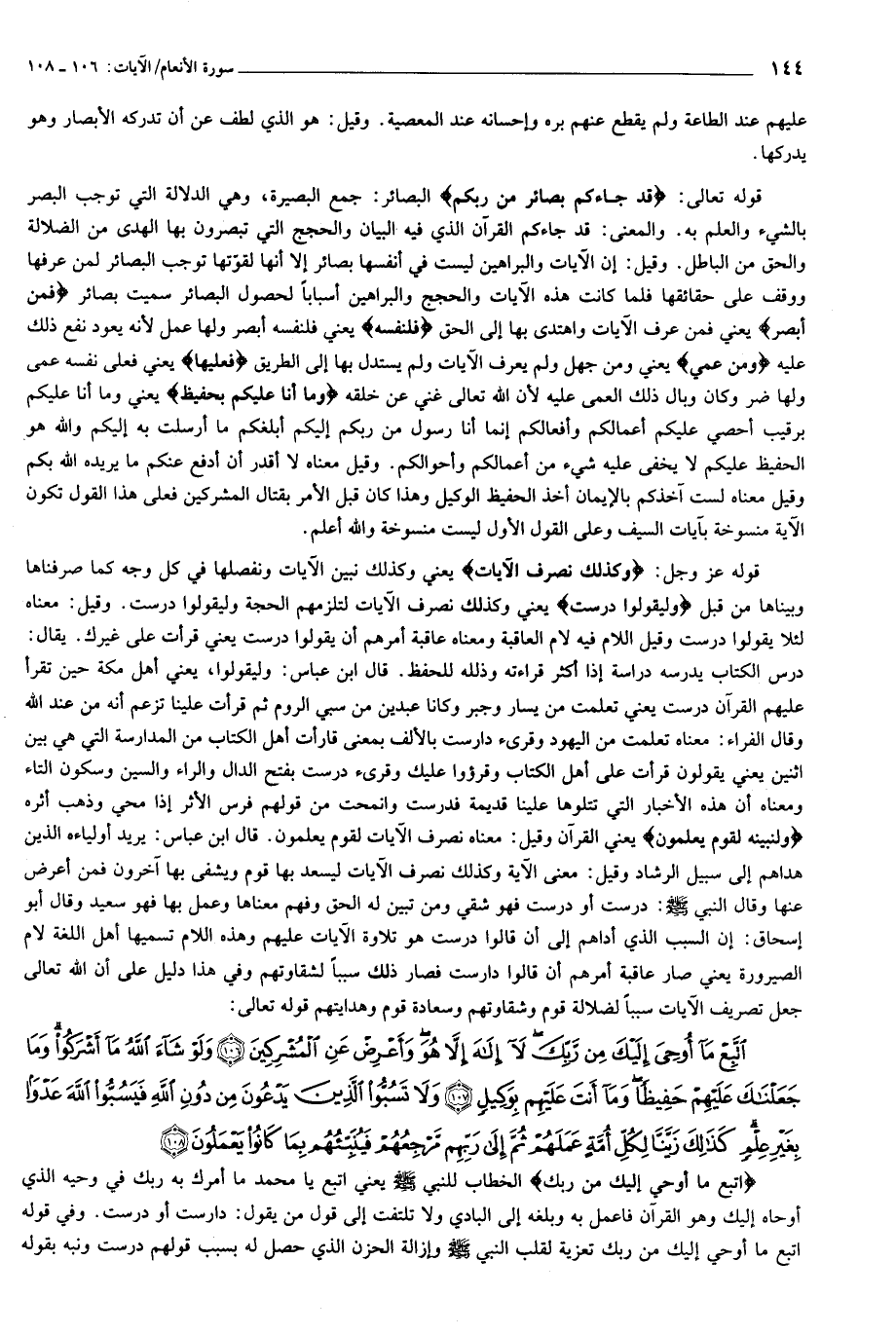 اتَّبِعْ ما أُوحِيَ إِلَيْكَ مِنْ رَبِّكَ لا إِلهَ إِلاَّ هُوَ وَأَعْرِضْ عَنِ الْمُشْرِكِينَ (106) وَلَوْ شاءَ اللَّهُ ما أَشْرَكُوا وَما جَعَلْناكَ عَلَيْهِمْ حَفِيظاً وَما أَنْتَ عَلَيْهِمْ بِوَكِيلٍ (107) وَلا تَسُبُّوا الَّذِينَ يَدْعُونَ مِنْ دُونِ اللَّهِ فَيَسُبُّوا اللَّهَ عَدْواً بِغَيْرِ عِلْمٍ كَذلِكَ زَيَّنَّا لِكُلِّ أُمَّةٍ عَمَلَهُمْ ثُمَّ إِلى رَبِّهِمْ مَرْجِعُهُمْ فَيُنَبِّئُهُمْ بِما كانُوا يَعْمَلُونَ (108)
