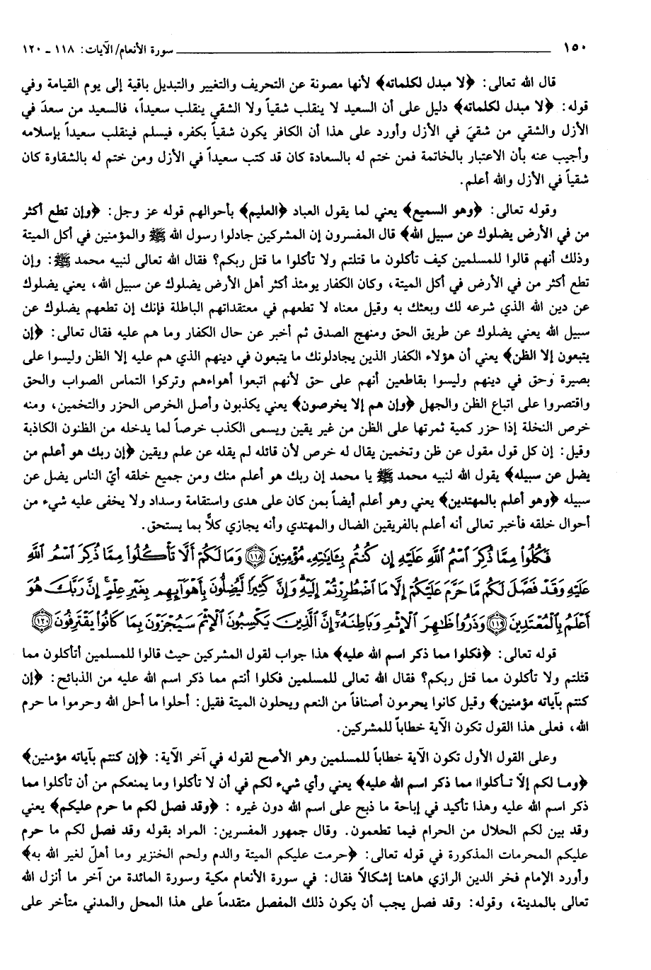 فَكُلُوا مِمَّا ذُكِرَ اسْمُ اللَّهِ عَلَيْهِ إِنْ كُنْتُمْ بِآياتِهِ مُؤْمِنِينَ (118) وَما لَكُمْ أَلاَّ تَأْكُلُوا مِمَّا ذُكِرَ اسْمُ اللَّهِ عَلَيْهِ وَقَدْ فَصَّلَ لَكُمْ ما حَرَّمَ عَلَيْكُمْ إِلاَّ مَا اضْطُرِرْتُمْ إِلَيْهِ وَإِنَّ كَثِيراً لَيُضِلُّونَ بِأَهْوائِهِمْ بِغَيْرِ عِلْمٍ إِنَّ رَبَّكَ هُوَ أَعْلَمُ بِالْمُعْتَدِينَ (119) وَذَرُوا ظاهِرَ الْإِثْمِ وَباطِنَهُ إِنَّ الَّذِينَ يَكْسِبُونَ الْإِثْمَ سَيُجْزَوْنَ بِما كانُوا يَقْتَرِفُونَ (120)