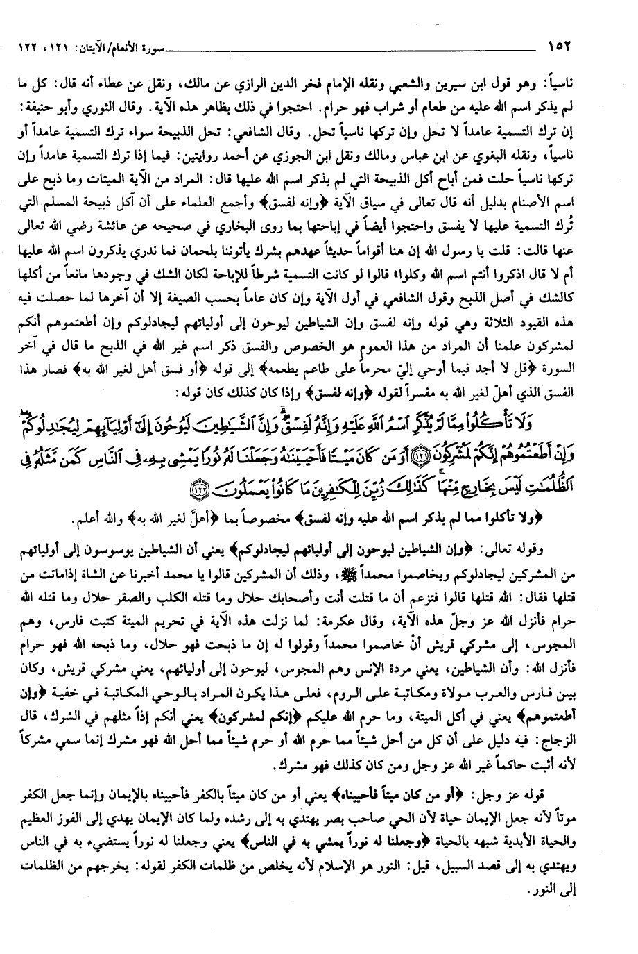 وَلا تَأْكُلُوا مِمَّا لَمْ يُذْكَرِ اسْمُ اللَّهِ عَلَيْهِ وَإِنَّهُ لَفِسْقٌ وَإِنَّ الشَّياطِينَ لَيُوحُونَ إِلى أَوْلِيائِهِمْ لِيُجادِلُوكُمْ وَإِنْ أَطَعْتُمُوهُمْ إِنَّكُمْ لَمُشْرِكُونَ (121) أَوَمَنْ كانَ مَيْتاً فَأَحْيَيْناهُ وَجَعَلْنا لَهُ نُوراً يَمْشِي بِهِ فِي النَّاسِ كَمَنْ مَثَلُهُ فِي الظُّلُماتِ لَيْسَ بِخارِجٍ مِنْها كَذلِكَ زُيِّنَ لِلْكافِرِينَ ما كانُوا يَعْمَلُونَ (122)