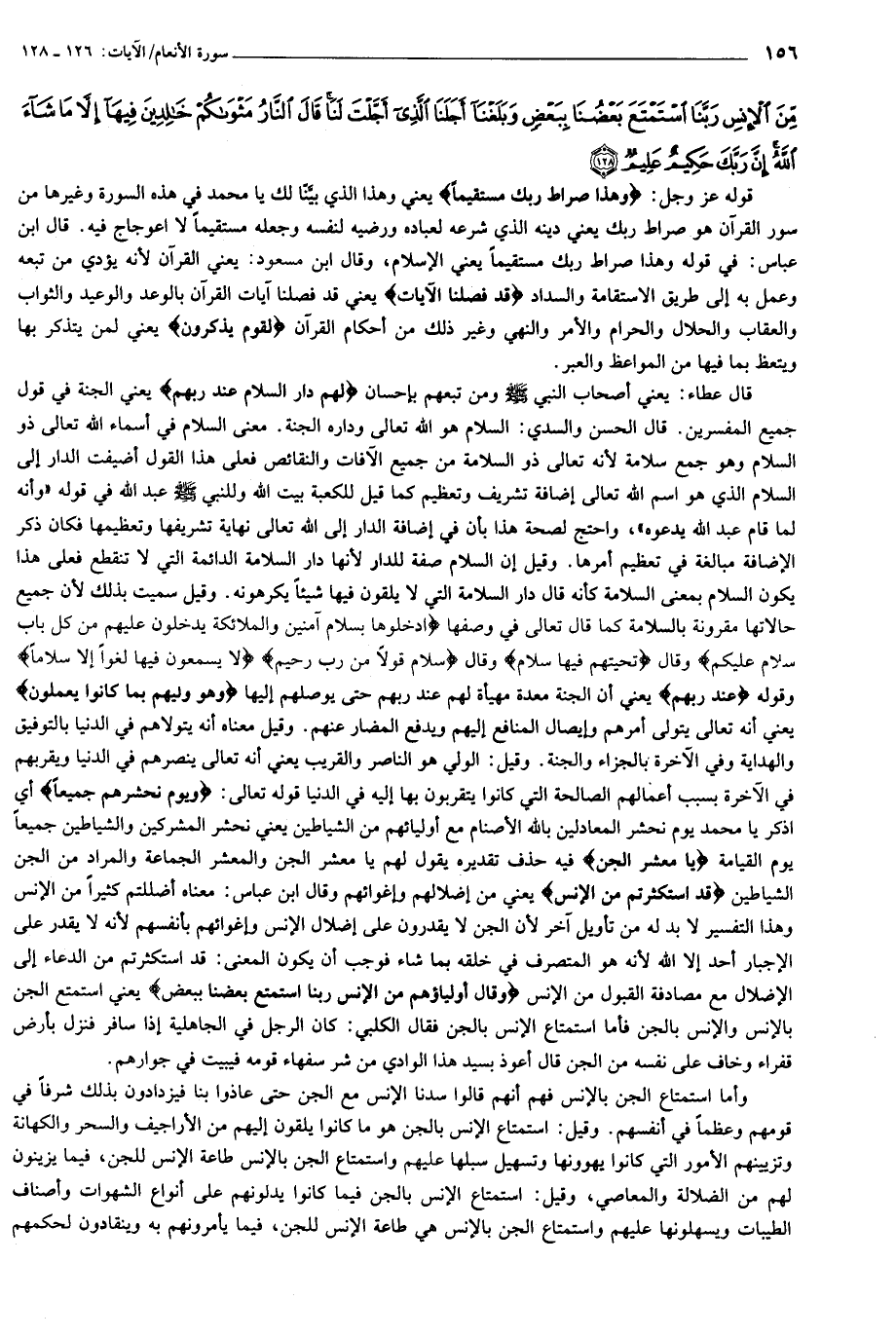 وَهذا صِراطُ رَبِّكَ مُسْتَقِيماً قَدْ فَصَّلْنَا الْآياتِ لِقَوْمٍ يَذَّكَّرُونَ (126) لَهُمْ دارُ السَّلامِ عِنْدَ رَبِّهِمْ وَهُوَ وَلِيُّهُمْ بِما كانُوا يَعْمَلُونَ (127) وَيَوْمَ يَحْشُرُهُمْ جَمِيعاً يا مَعْشَرَ الْجِنِّ قَدِ اسْتَكْثَرْتُمْ مِنَ الْإِنْسِ وَقالَ أَوْلِياؤُهُمْ مِنَ الْإِنْسِ رَبَّنَا اسْتَمْتَعَ بَعْضُنا بِبَعْضٍ وَبَلَغْنا أَجَلَنَا الَّذِي أَجَّلْتَ لَنا قالَ النَّارُ مَثْواكُمْ خالِدِينَ فِيها إِلاَّ ما شاءَ اللَّهُ إِنَّ رَبَّكَ حَكِيمٌ عَلِيمٌ (128)