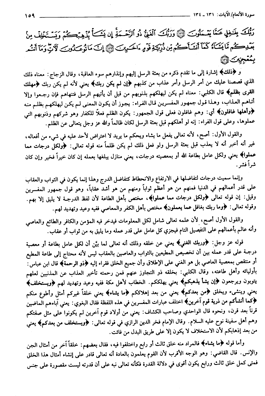 ذلِكَ أَنْ لَمْ يَكُنْ رَبُّكَ مُهْلِكَ الْقُرى بِظُلْمٍ وَأَهْلُها غافِلُونَ (131) وَلِكُلٍّ دَرَجاتٌ مِمَّا عَمِلُوا وَما رَبُّكَ بِغافِلٍ عَمَّا يَعْمَلُونَ (132) وَرَبُّكَ الْغَنِيُّ ذُو الرَّحْمَةِ إِنْ يَشَأْ يُذْهِبْكُمْ وَيَسْتَخْلِفْ مِنْ بَعْدِكُمْ ما يَشاءُ كَما أَنْشَأَكُمْ مِنْ ذُرِّيَّةِ قَوْمٍ آخَرِينَ (133) إِنَّ ما تُوعَدُونَ لَآتٍ وَما أَنْتُمْ بِمُعْجِزِينَ (134)