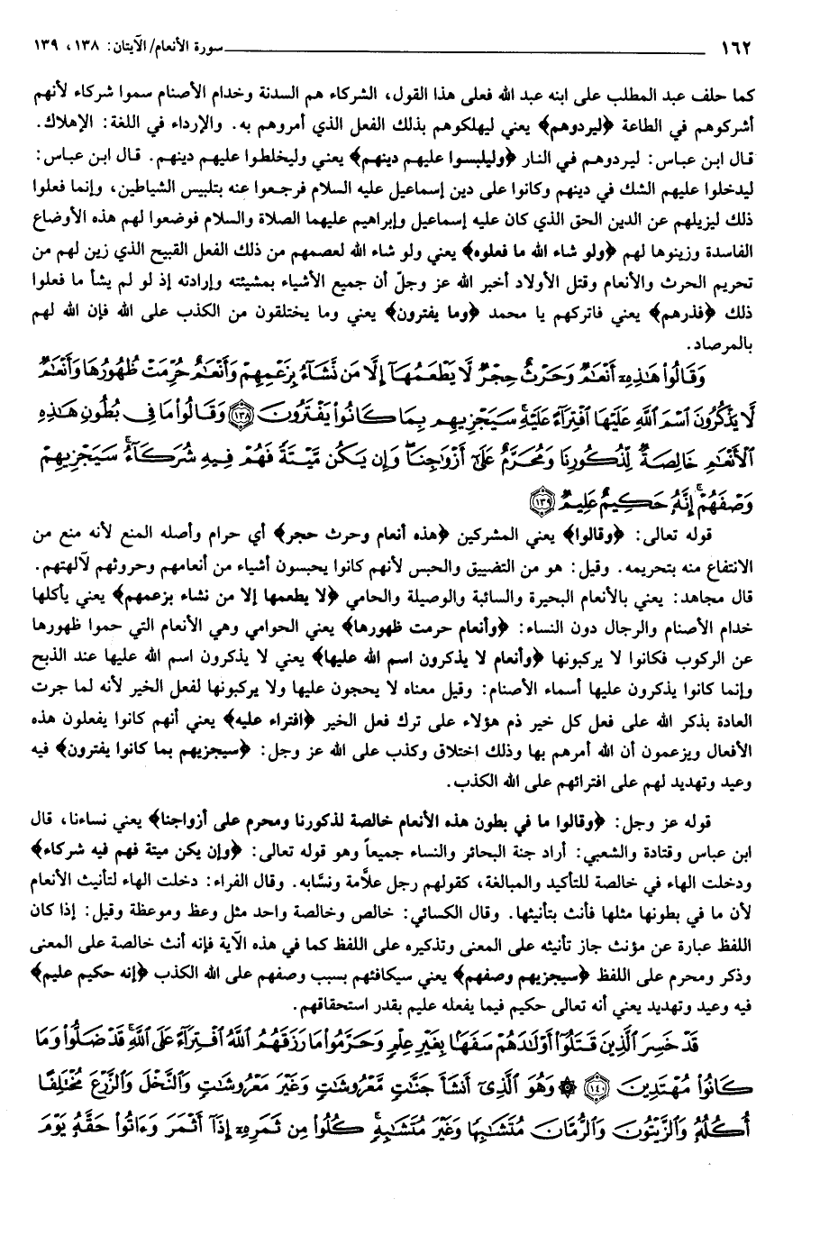 وَقالُوا هذِهِ أَنْعامٌ وَحَرْثٌ حِجْرٌ لا يَطْعَمُها إِلاَّ مَنْ نَشاءُ بِزَعْمِهِمْ وَأَنْعامٌ حُرِّمَتْ ظُهُورُها وَأَنْعامٌ لا يَذْكُرُونَ اسْمَ اللَّهِ عَلَيْهَا افْتِراءً عَلَيْهِ سَيَجْزِيهِمْ بِما كانُوا يَفْتَرُونَ (138) وَقالُوا ما فِي بُطُونِ هذِهِ الْأَنْعامِ خالِصَةٌ لِذُكُورِنا وَمُحَرَّمٌ عَلى أَزْواجِنا وَإِنْ يَكُنْ مَيْتَةً فَهُمْ فِيهِ شُرَكاءُ سَيَجْزِيهِمْ وَصْفَهُمْ إِنَّهُ حَكِيمٌ عَلِيمٌ (139)