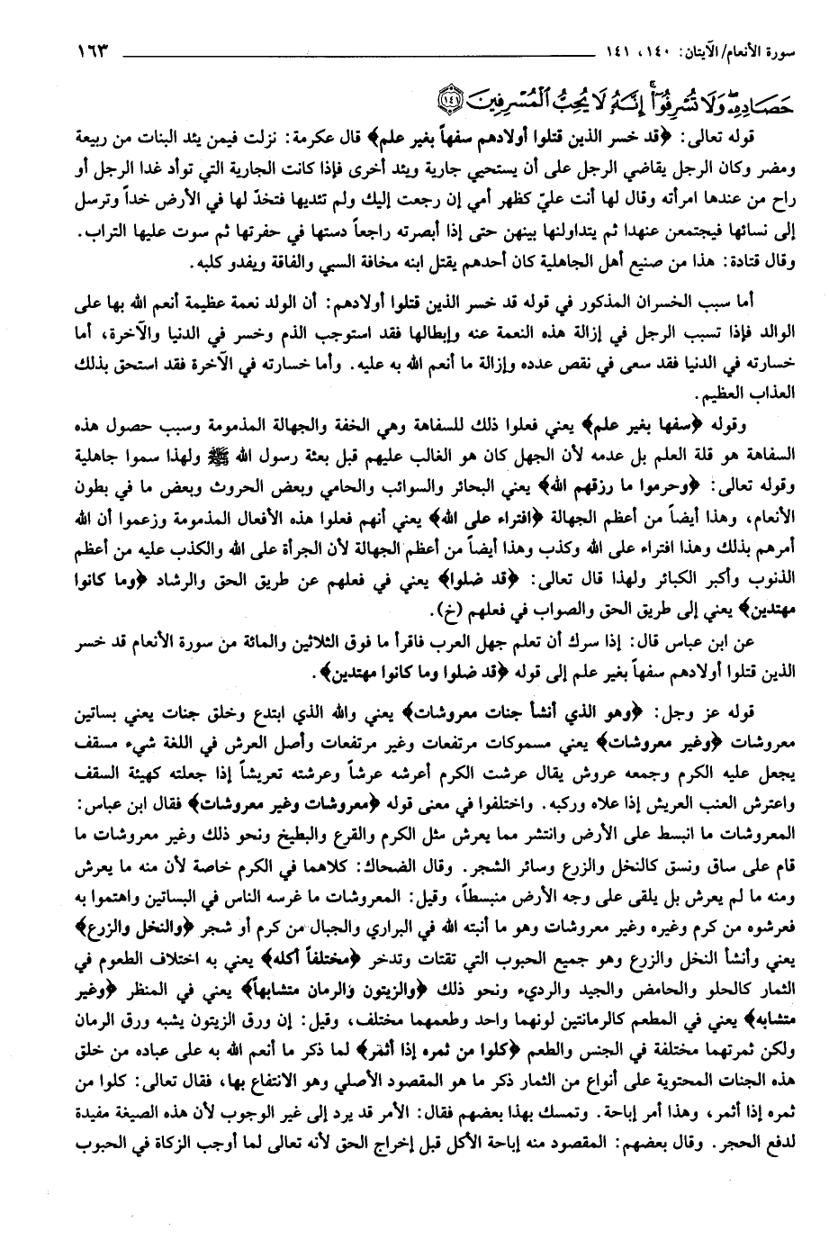 قَدْ خَسِرَ الَّذِينَ قَتَلُوا أَوْلادَهُمْ سَفَهاً بِغَيْرِ عِلْمٍ وَحَرَّمُوا ما رَزَقَهُمُ اللَّهُ افْتِراءً عَلَى اللَّهِ قَدْ ضَلُّوا وَما كانُوا مُهْتَدِينَ (140) وَهُوَ الَّذِي أَنْشَأَ جَنَّاتٍ مَعْرُوشاتٍ وَغَيْرَ مَعْرُوشاتٍ وَالنَّخْلَ وَالزَّرْعَ مُخْتَلِفاً أُكُلُهُ وَالزَّيْتُونَ وَالرُّمَّانَ مُتَشابِهاً وَغَيْرَ مُتَشابِهٍ كُلُوا مِنْ ثَمَرِهِ إِذا أَثْمَرَ وَآتُوا حَقَّهُ يَوْمَ حَصادِهِ وَلا تُسْرِفُوا إِنَّهُ لا يُحِبُّ الْمُسْرِفِينَ (141)
