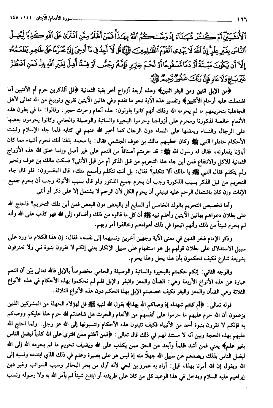 وَمِنَ الْإِبِلِ اثْنَيْنِ وَمِنَ الْبَقَرِ اثْنَيْنِ قُلْ آلذَّكَرَيْنِ حَرَّمَ أَمِ الْأُنْثَيَيْنِ أَمَّا اشْتَمَلَتْ عَلَيْهِ أَرْحامُ الْأُنْثَيَيْنِ أَمْ كُنْتُمْ شُهَداءَ إِذْ وَصَّاكُمُ اللَّهُ بِهذا فَمَنْ أَظْلَمُ مِمَّنِ افْتَرى عَلَى اللَّهِ كَذِباً لِيُضِلَّ النَّاسَ بِغَيْرِ عِلْمٍ إِنَّ اللَّهَ لا يَهْدِي الْقَوْمَ الظَّالِمِينَ (144) قُلْ لا أَجِدُ فِي ما أُوحِيَ إِلَيَّ مُحَرَّماً عَلى طاعِمٍ يَطْعَمُهُ إِلاَّ أَنْ يَكُونَ مَيْتَةً أَوْ دَماً مَسْفُوحاً أَوْ لَحْمَ خِنزِيرٍ فَإِنَّهُ رِجْسٌ أَوْ فِسْقاً أُهِلَّ لِغَيْرِ اللَّهِ بِهِ فَمَنِ اضْطُرَّ غَيْرَ باغٍ وَلا عادٍ فَإِنَّ رَبَّكَ غَفُورٌ رَحِيمٌ (145)