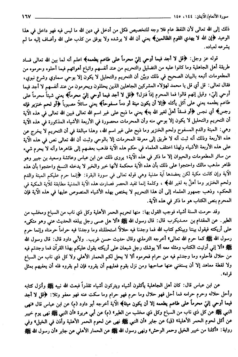 عن ابن عباس قال: كان أهل الجاهلية يأكلون أشياء ويتركون أشياء تقذرا فبعث الله نبيه صلى الله عليه وسلم وأنزل كتابه وأحل حلاله وحرم حرامه فما أحل فهو حلال وما حرم فهو حرام وما سكت عنه فهو معفو وتلا: قُلْ لا أَجِدُ فِي ما أُوحِيَ إِلَيَّ مُحَرَّماً عَلى طاعِمٍ يَطْعَمُهُ إِلَّا أَنْ يَكُونَ مَيْتَةً الآية أخرجه أبو داود (م) عن ابن عباس قال «نهى النبي صلى الله عليه وسلم عن كل ذي ناب من السباع وكل ذي مخلب من الطير» (م) عن أبي هريرة «أن النبي صلى الله عليه وسلم نهى يوم خيبر عن أكل لحوم الحمر الأهلية» (ق) عن جابر «أن النبي صلى الله عليه وسلم نهى عن لحوم الحمر الأهلية وأذن في الخيل» وفي رواية: «أكلنا من خيبر الخيل وحمر الوحش» ونهى رسول الله صلى الله عليه وسلم عن الحمار الأهلي عن جابر «أن رسول الله صلى الله عليه وسلم