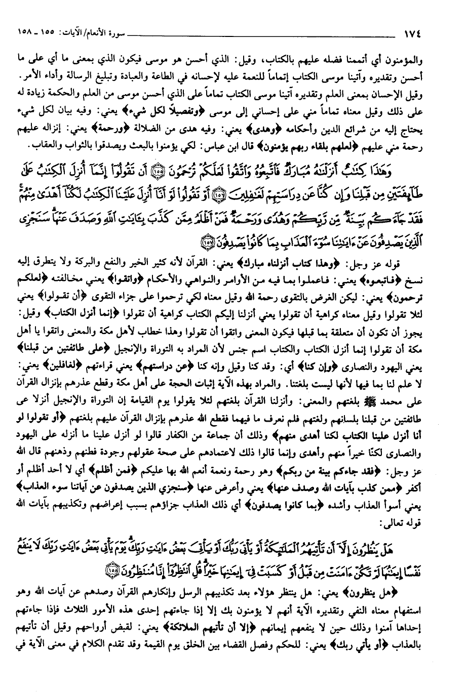 وَهذا كِتابٌ أَنْزَلْناهُ مُبارَكٌ فَاتَّبِعُوهُ وَاتَّقُوا لَعَلَّكُمْ تُرْحَمُونَ (155) أَنْ تَقُولُوا إِنَّما أُنْزِلَ الْكِتابُ عَلى طائِفَتَيْنِ مِنْ قَبْلِنا وَإِنْ كُنَّا عَنْ دِراسَتِهِمْ لَغافِلِينَ (156) أَوْ تَقُولُوا لَوْ أَنَّا أُنْزِلَ عَلَيْنَا الْكِتابُ لَكُنَّا أَهْدى مِنْهُمْ فَقَدْ جاءَكُمْ بَيِّنَةٌ مِنْ رَبِّكُمْ وَهُدىً وَرَحْمَةٌ فَمَنْ أَظْلَمُ مِمَّنْ كَذَّبَ بِآياتِ اللَّهِ وَصَدَفَ عَنْها سَنَجْزِي الَّذِينَ يَصْدِفُونَ عَنْ آياتِنا سُوءَ الْعَذابِ بِما كانُوا يَصْدِفُونَ (157)
