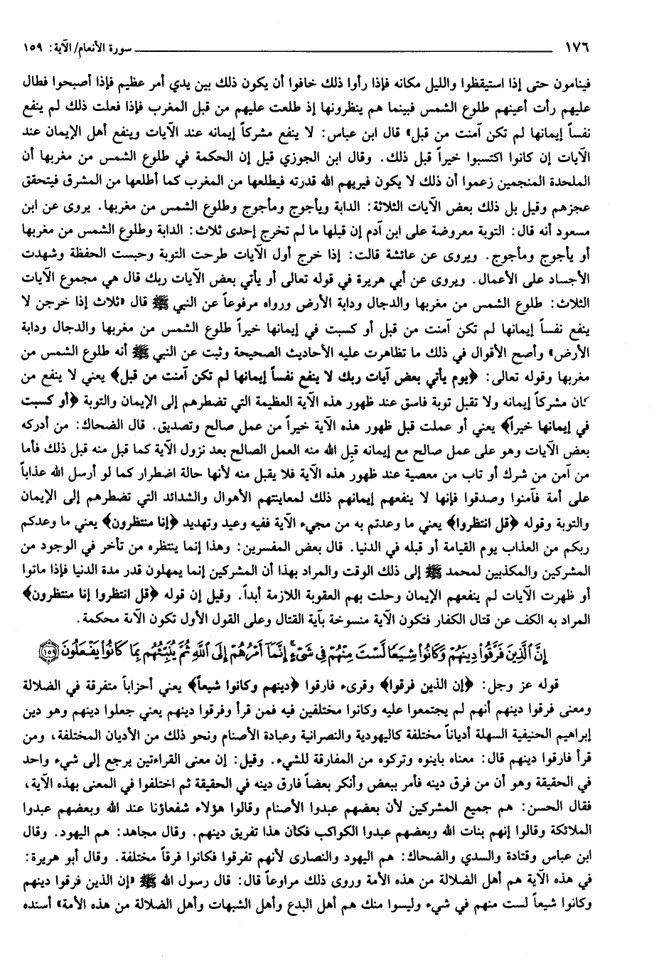 إِنَّ الَّذِينَ فَرَّقُوا دِينَهُمْ وَكانُوا شِيَعاً لَسْتَ مِنْهُمْ فِي شَيْءٍ إِنَّما أَمْرُهُمْ إِلَى اللَّهِ ثُمَّ يُنَبِّئُهُمْ بِما كانُوا يَفْعَلُونَ (159)