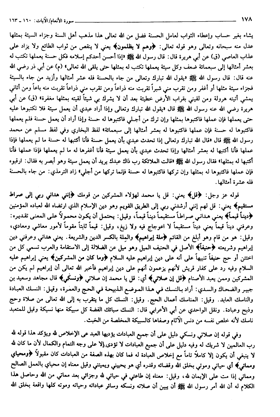 وعرفني دينا قيما يعني دينا مستقيما لا اعوجاج فيه ولا زيغ، وقيل: قيما ثابتا مقوما لأمور معاشي ومعادي، وقيل: هو من قام وهو أبلغ من القائم مِلَّةَ إِبْراهِيمَ والملة بالكسر الدين والشريعة. يعني هداني وعرفني دين إبراهيم وشريعته حَنِيفاً الأصل في الحنيف الميل وهو ميل عن الضلالة إلى الاستقامة والعرب تسمي كل من اختتن أو حج حنيفا تنبيها على أنه على دين إبراهيم عليه السلام وَما كانَ مِنَ الْمُشْرِكِينَ يعني إبراهيم عليه السلام وفيه رد على كفار قريش لأنهم يزعمون أنهم على دين إبراهيم فأخبر الله تعالى أن إبراهيم لم يكن من المشركين وممن يعبد الأصنام قُلْ إِنَّ صَلاتِي أي: قل يا محمد إن صلاتي وَنُسُكِي قال مجاهد وسعيد بن جبير والضحاك والسدي: أراد بالنسك في هذا الموضع الذبيحة في الحج والعمرة، وقيل: النسك العبادة والناسك العابد. وقيل: المناسك أعمال الحج. وقيل: النسك كل ما يتقرب به إلى الله تعالى من صلاة وحج وذبح وعبادة. ونقل الواحدي عن أبي الأعرابي قال: النسك سبائك الفضة كل سبيكة منها نسيكة وقيل للمتعبد ناسك لأنه خلص نفسه من دنس الآثام وصفاها كالسبيكة المخلصة من الخبث.