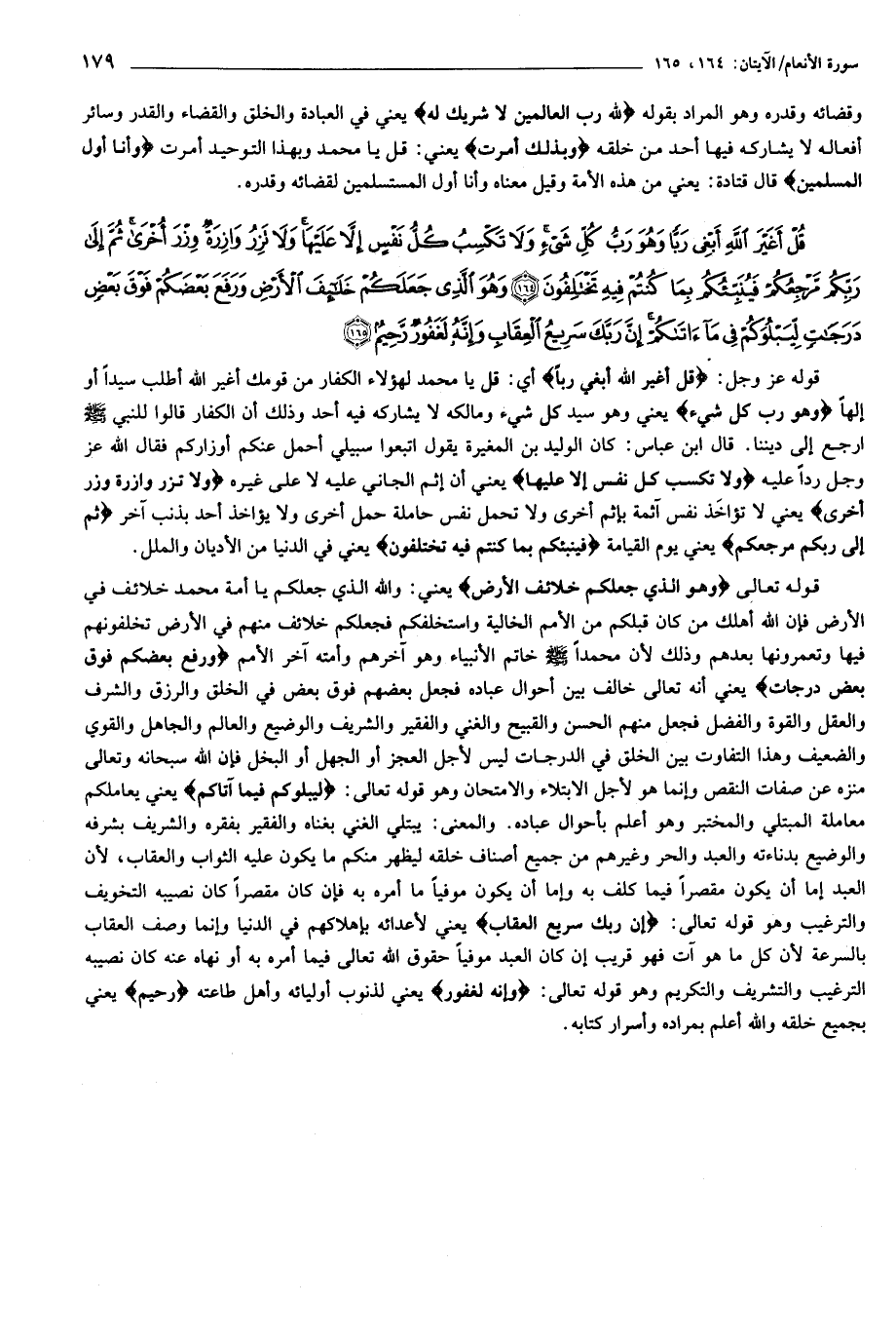 قُلْ أَغَيْرَ اللَّهِ أَبْغِي رَبًّا وَهُوَ رَبُّ كُلِّ شَيْءٍ وَلا تَكْسِبُ كُلُّ نَفْسٍ إِلاَّ عَلَيْها وَلا تَزِرُ وازِرَةٌ وِزْرَ أُخْرى ثُمَّ إِلى رَبِّكُمْ مَرْجِعُكُمْ فَيُنَبِّئُكُمْ بِما كُنْتُمْ فِيهِ تَخْتَلِفُونَ (164) وَهُوَ الَّذِي جَعَلَكُمْ خَلائِفَ الْأَرْضِ وَرَفَعَ بَعْضَكُمْ فَوْقَ بَعْضٍ دَرَجاتٍ لِيَبْلُوَكُمْ فِي ما آتاكُمْ إِنَّ رَبَّكَ سَرِيعُ الْعِقابِ وَإِنَّهُ لَغَفُورٌ رَحِيمٌ (165)