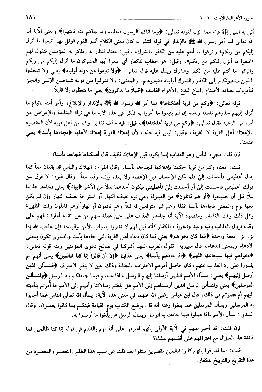 قوله تعالى: وَكَمْ مِنْ قَرْيَةٍ أَهْلَكْناها لما أمر الله رسول الله صلى الله عليه وسلم بالإنذار والإبلاغ، وأمر أمته باتباع ما أنزله إليهم حذرهم نقمته وبأسه إن لم يتبعوا ما أمروا به فذكر في هذه الآية ما في ترك المتابعة والإعراض عن أمره من الوعيد فقال تعالى: وَكَمْ مِنْ قَرْيَةٍ أَهْلَكْناها، قيل: فيه حذف تقديره وكم من أهل قرية لأن المقصود بالإهلاك أهل القرية لا القرية، وقيل: ليس فيه حذف لأن إهلاك القرية إهلاك لأهلها فَجاءَها بَأْسُنا يعني عذابنا.
