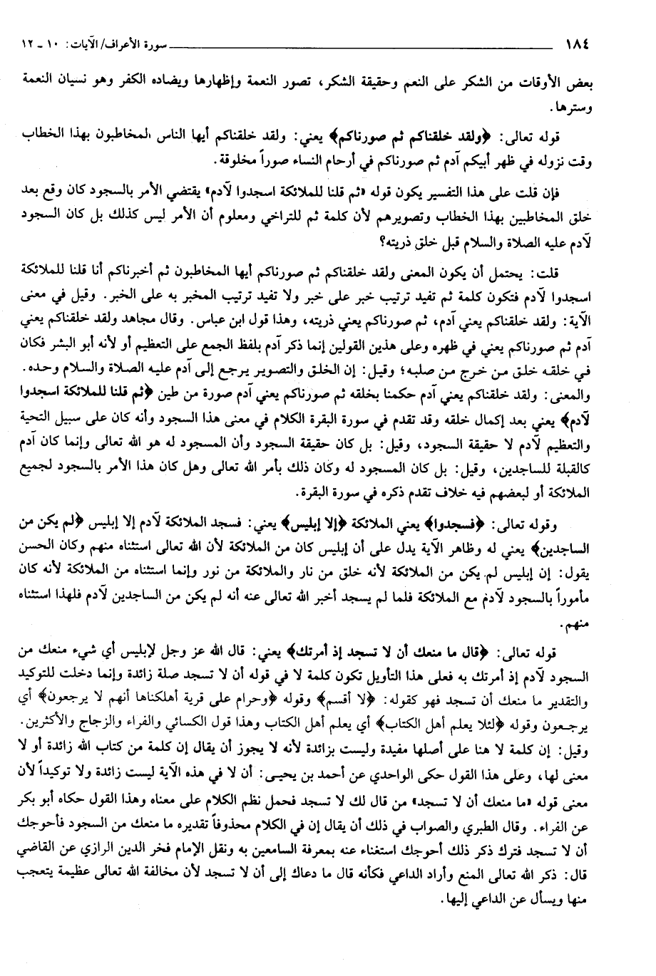 قلت: يحتمل أن يكون المعنى ولقد خلقناكم ثم صورناكم أيها المخاطبون ثم أخبرناكم أنا قلنا للملائكة اسجدوا لآدم فتكون كلمة ثم تفيد ترتيب خبر على خبر ولا تفيد ترتيب المخبر به على الخبر. وقيل في معنى الآية: ولقد خلقناكم يعني آدم، ثم صورناكم يعني ذريته، وهذا قول ابن عباس. وقال مجاهد ولقد خلقناكم يعني آدم ثم صورناكم يعني في ظهره وعلى هذين القولين إنما ذكر آدم بلفظ الجمع على التعظيم أو لأنه أبو البشر فكان في خلقه خلق من خرج من صلبه وقيل: إن الخلق والتصوير يرجع إلى آدم عليه الصلاة والسلام وحده.