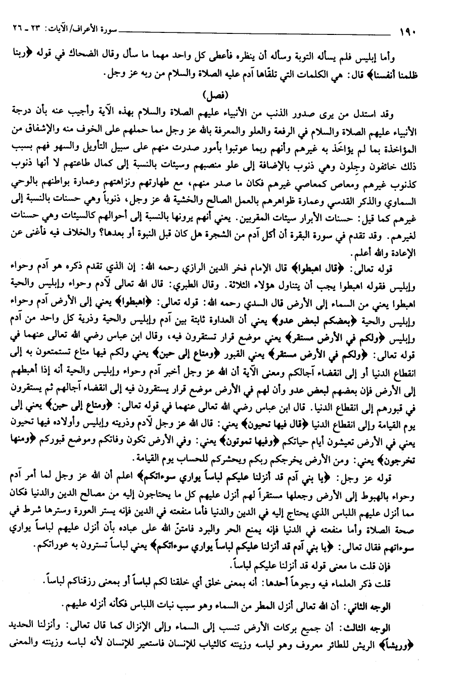 قوله تعالى: قالَ اهْبِطُوا قال الإمام فخر الدين الرازي رحمه الله: إن الذي تقدم ذكره هو آدم وحواء وإبليس فقوله اهبطوا يجب أن يتناول هؤلاء الثلاثة. وقال الطبري: قال الله تعالى لآدم وحواء وإبليس والحية اهبطوا يعني من السماء إلى الأرض قال السدي رحمه الله: قوله تعالى: اهْبِطُوا يعني إلى الأرض آدم وحواء وإبليس والحية بَعْضُكُمْ لِبَعْضٍ عَدُوٌّ يعني أن العداوة ثابتة بين آدم وإبليس والحية وذرية كل واحد من آدم وإبليس وَلَكُمْ فِي الْأَرْضِ مُسْتَقَرٌّ يعني موضع قرار تستقرون فيه، وقال ابن عباس رضي الله تعالى عنهما في قوله تعالى: وَلَكُمْ فِي الْأَرْضِ مُسْتَقَرٌّ يعني القبور وَمَتاعٌ إِلى حِينٍ يعني ولكم فيها متاع تستمتعون به إلى انقطاع الدنيا أو إلى انقضاء آجالكم ومعنى الآية أن الله عز وجل أخبر آدم وحواء وإبليس والحية أنه إذا أهبطهم إلى الأرض فإن بعضهم لبعض عدو وأن لهم في الأرض موضع قرار يستقرون فيه إلى انقضاء آجالهم ثم يستقرون في قبورهم إلى انقطاع الدنيا. قال ابن عباس رضي الله تعالى عنهما في قوله تعالى: وَمَتاعٌ إِلى حِينٍ يعني إلى يوم القيامة وإلى انقطاع الدنيا قالَ فِيها تَحْيَوْنَ يعني: قال الله عز وجل لآدم وذريته وإبليس وأولاده فيها تحيون يعني في الأرض تعيشون أيام حياتكم وَفِيها تَمُوتُونَ يعني: وفي الأرض تكون وفاتكم وموضع قبوركم وَمِنْها تُخْرَجُونَ يعني: ومن الأرض يخرجكم ربكم ويحشركم للحساب يوم القيامة.