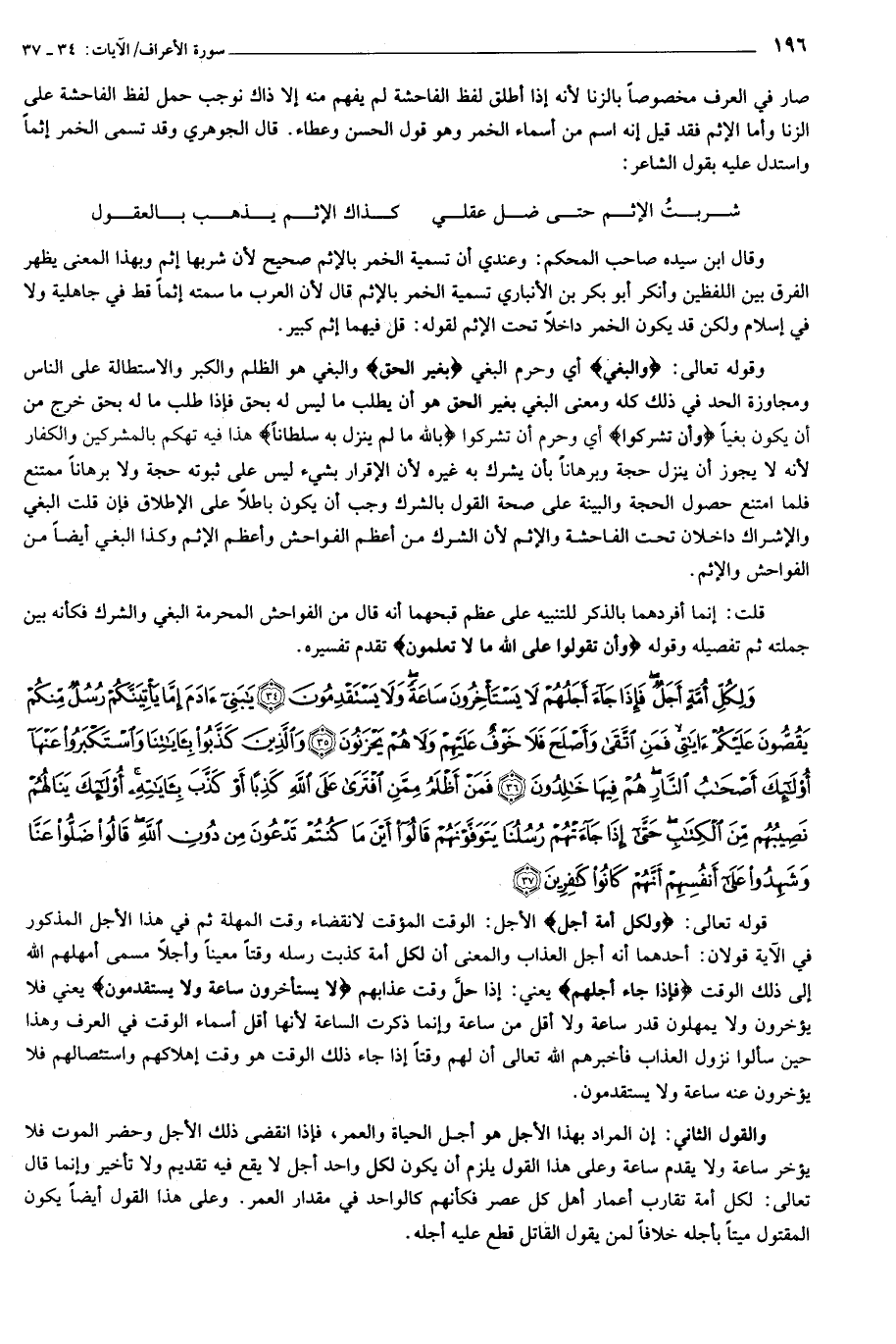 وقوله تعالى: وَالْبَغْيَ أي وحرم البغي بِغَيْرِ الْحَقِّ والبغي هو الظلم والكبر والاستطالة على الناس ومجاوزة الحد في ذلك كله ومعنى البغي بغير الحق هو أن يطلب ما ليس له بحق فإذا طلب ما له بحق خرج من أن يكون بغيا وَأَنْ تُشْرِكُوا أي وحرم أن تشركوا بِاللَّهِ ما لَمْ يُنَزِّلْ بِهِ سُلْطاناً هذا فيه تهكم بالمشركين والكفار لأنه لا يجوز أن ينزل حجة وبرهانا بأن يشرك به غيره لأن الإقرار بشيء ليس على ثبوته حجة ولا برهانا ممتنع فلما امتنع حصول الحجة والبينة على صحة القول بالشرك وجب أن يكون باطلا على الإطلاق فإن قلت البغي والإشراك داخلان تحت الفاحشة والإثم لأن الشرك من أعظم الفواحش وأعظم الإثم وكذا البغي أيضا من الفواحش والإثم.