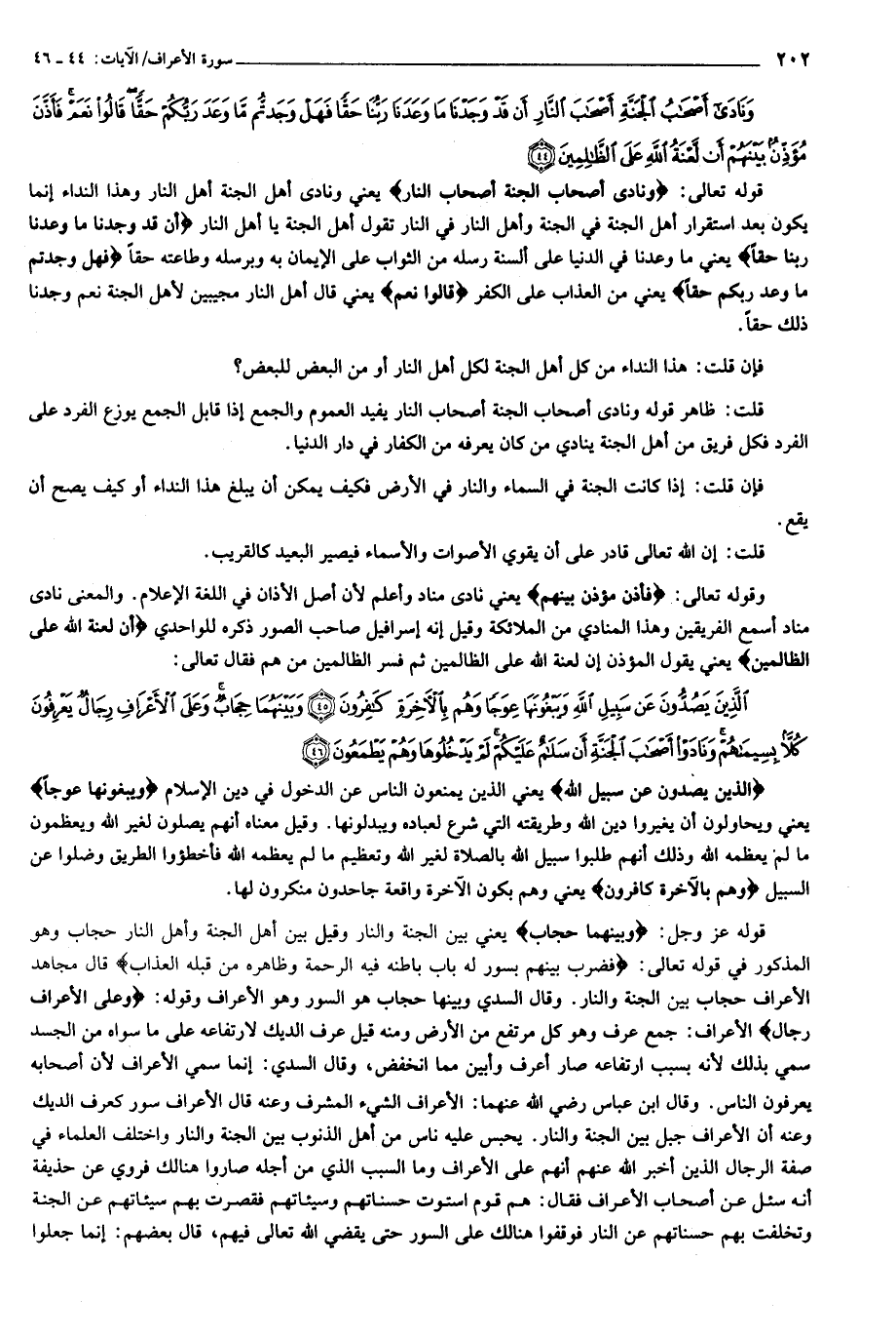 الَّذِينَ يَصُدُّونَ عَنْ سَبِيلِ اللَّهِ وَيَبْغُونَها عِوَجاً وَهُمْ بِالْآخِرَةِ كافِرُونَ (45) وَبَيْنَهُما حِجابٌ وَعَلَى الْأَعْرافِ رِجالٌ يَعْرِفُونَ كُلاًّ بِسِيماهُمْ وَنادَوْا أَصْحابَ الْجَنَّةِ أَنْ سَلامٌ عَلَيْكُمْ لَمْ يَدْخُلُوها وَهُمْ يَطْمَعُونَ (46)