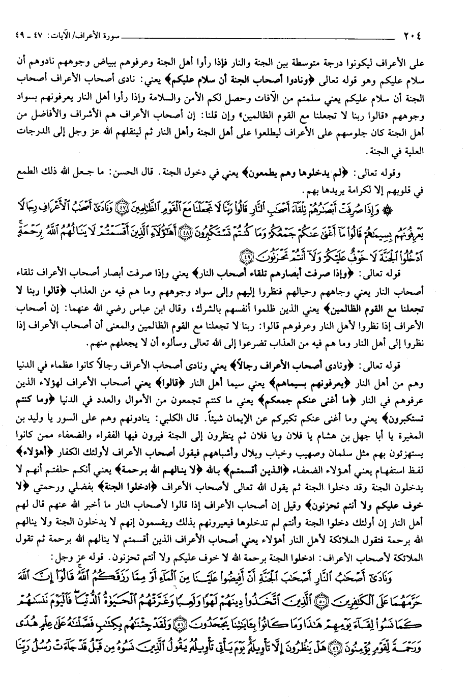 وَإِذا صُرِفَتْ أَبْصارُهُمْ تِلْقاءَ أَصْحابِ النَّارِ قالُوا رَبَّنا لا تَجْعَلْنا مَعَ الْقَوْمِ الظَّالِمِينَ (47) وَنادى أَصْحابُ الْأَعْرافِ رِجالاً يَعْرِفُونَهُمْ بِسِيماهُمْ قالُوا ما أَغْنى عَنْكُمْ جَمْعُكُمْ وَما كُنْتُمْ تَسْتَكْبِرُونَ (48) أَهؤُلاءِ الَّذِينَ أَقْسَمْتُمْ لا يَنالُهُمُ اللَّهُ بِرَحْمَةٍ ادْخُلُوا الْجَنَّةَ لا خَوْفٌ عَلَيْكُمْ وَلا أَنْتُمْ تَحْزَنُونَ (49)