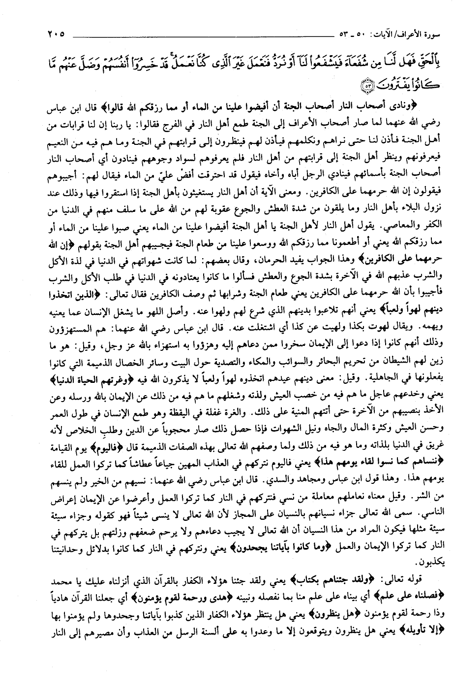 وَنادى أَصْحابُ النَّارِ أَصْحابَ الْجَنَّةِ أَنْ أَفِيضُوا عَلَيْنا مِنَ الْماءِ أَوْ مِمَّا رَزَقَكُمُ اللَّهُ قالُوا إِنَّ اللَّهَ حَرَّمَهُما عَلَى الْكافِرِينَ (50) الَّذِينَ اتَّخَذُوا دِينَهُمْ لَهْواً وَلَعِباً وَغَرَّتْهُمُ الْحَياةُ الدُّنْيا فَالْيَوْمَ نَنْساهُمْ كَما نَسُوا لِقاءَ يَوْمِهِمْ هذا وَما كانُوا بِآياتِنا يَجْحَدُونَ (51) وَلَقَدْ جِئْناهُمْ بِكِتابٍ فَصَّلْناهُ عَلى عِلْمٍ هُدىً وَرَحْمَةً لِقَوْمٍ يُؤْمِنُونَ (52) هَلْ يَنْظُرُونَ إِلاَّ تَأْوِيلَهُ يَوْمَ يَأْتِي تَأْوِيلُهُ يَقُولُ الَّذِينَ نَسُوهُ مِنْ قَبْلُ قَدْ جاءَتْ رُسُلُ رَبِّنا بِالْحَقِّ فَهَلْ لَنا مِنْ شُفَعاءَ فَيَشْفَعُوا لَنا أَوْ نُرَدُّ فَنَعْمَلَ غَيْرَ الَّذِي كُنَّا نَعْمَلُ قَدْ خَسِرُوا أَنْفُسَهُمْ وَضَلَّ عَنْهُمْ ما كانُوا يَفْتَرُونَ (53)