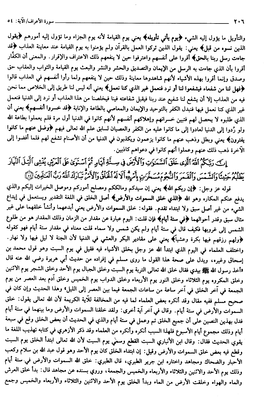 إِنَّ رَبَّكُمُ اللَّهُ الَّذِي خَلَقَ السَّماواتِ وَالْأَرْضَ فِي سِتَّةِ أَيَّامٍ ثُمَّ اسْتَوى عَلَى الْعَرْشِ يُغْشِي اللَّيْلَ النَّهارَ يَطْلُبُهُ حَثِيثاً وَالشَّمْسَ وَالْقَمَرَ وَالنُّجُومَ مُسَخَّراتٍ بِأَمْرِهِ أَلا لَهُ الْخَلْقُ وَالْأَمْرُ تَبارَكَ اللَّهُ رَبُّ الْعالَمِينَ (54)
