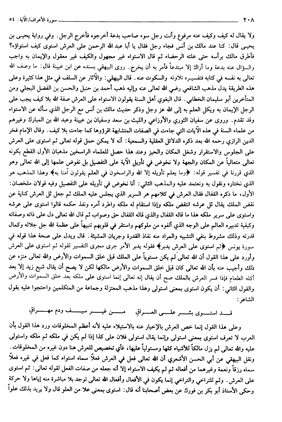 فأطرق مالك برأسه حتى علته الرحضاء ثم قال الاستواء غير مجهول والكيف غير معقول والإيمان به واجب والسؤال عنه بدعة وما أراك إلا مبتدعا فأمر به أن يخرج. روى البيهقي بسنده عن ابن عيينة قال: ما وصف الله تعالى به نفسه في كتابه فتفسيره تلاوته والسكوت عنه. قال البيهقي: والآثار عن السلف في مثل هذا كثيرة وعلى هذه الطريقة يدل مذهب الشافعي رضي الله تعالى عنه وإليه ذهب أحمد بن حنبل والحسن بن الفضل البجلي ومن المتأخرين أبو سليمان الخطابي. قال البغوي أهل السنة يقولون الاستواء على العرش صفة الله بلا كيف يجب على الرجل الإيمان به ويكل العلم به إلى الله عز وجل وذكر حديث مالك بن أنس مع الرجل الذي سأله عن الاستواء وقد تقدم. وروى عن سفيان الثوري والأوزاعي والليث بن سعد وسفيان بن عيينة وعبد الله بن المبارك وغيرهم من علماء السنة في هذه الآيات التي جاءت في الصفات المتشابهة اقرءوها كما جاءت بلا كيف. وقال الإمام فخر الدين الرازي رحمه الله بعد ذكره الدلائل العقلية والسمعية: أنه لا يمكن حمل قوله تعالى ثم استوى على العرش على الجلوس والاستقرار وشغل المكان والحيز وعند هذا حصل للعلماء الراسخين مذهبان الأول القطع بكونه تعالى متعاليا عن المكان والجهة ولا نخوض في تأويل الآية على التفصيل بل نفوض علمها إلى الله تعالى وهو الذي قررنا في تفسير قوله: وَما يَعْلَمُ تَأْوِيلَهُ إِلَّا اللَّهُ وَالرَّاسِخُونَ فِي الْعِلْمِ يَقُولُونَ آمَنَّا بِهِ وهذا المذهب هو الذي نختاره ونقول به ونعتمد عليه والمذهب الثاني: أنا نخوض في تأويله على التفصيل وفيه قولان ملخصان: