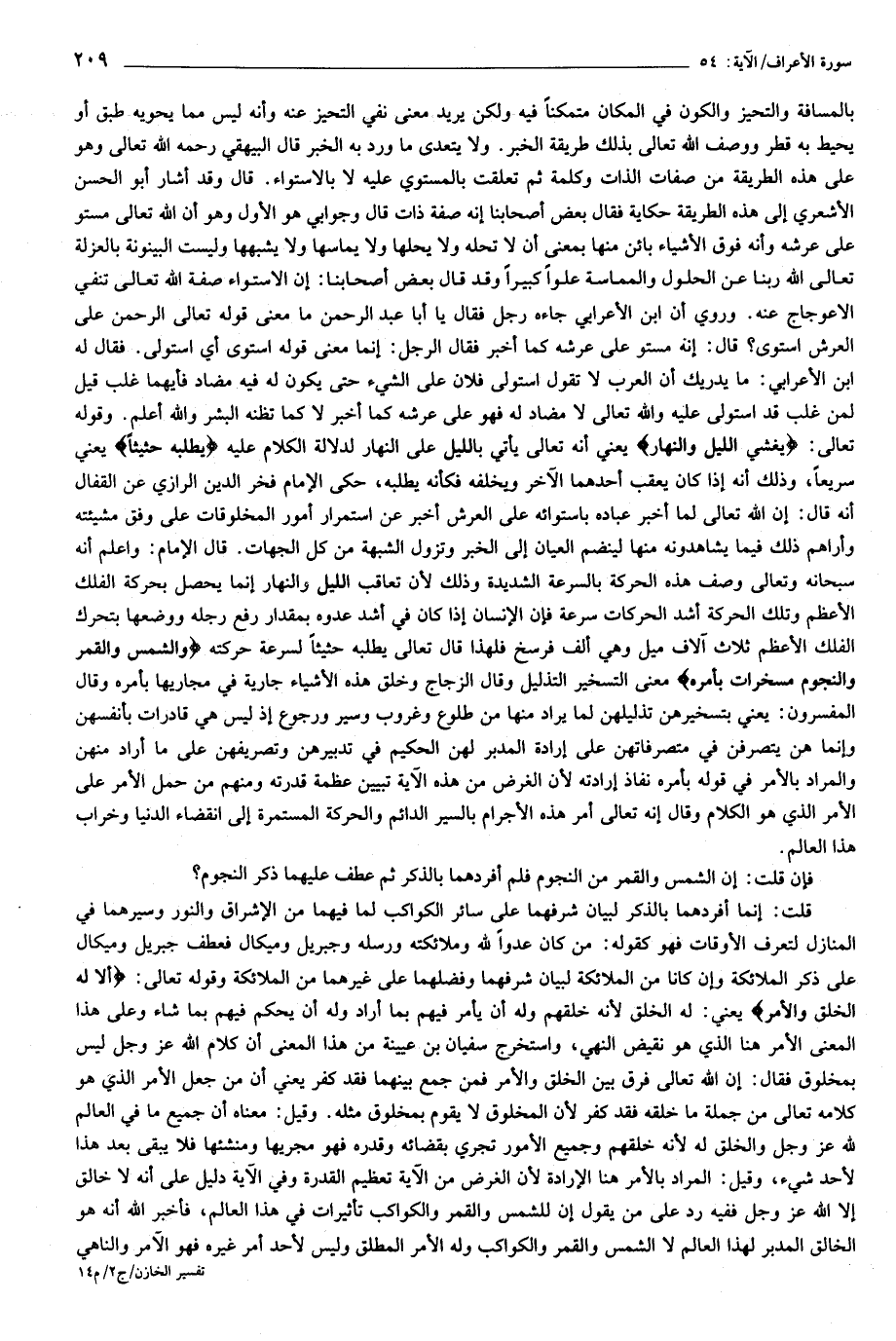 بالمسافة والتحيز والكون في المكان متمكنا فيه ولكن يريد معنى نفي التحيز عنه وأنه ليس مما يحويه طبق أو يحيط به قطر ووصف الله تعالى بذلك طريقة الخبر. ولا يتعدى ما ورد به الخبر قال البيهقي رحمه الله تعالى وهو على هذه الطريقة من صفات الذات وكلمة ثم تعلقت بالمستوي عليه لا بالاستواء. قال وقد أشار أبو الحسن الأشعري إلى هذه الطريقة حكاية فقال بعض أصحابنا إنه صفة ذات قال وجوابي هو الأول وهو أن الله تعالى مستو على عرشه وأنه فوق الأشياء بائن منها بمعنى أن لا تحله ولا يحلها ولا يماسها ولا يشبهها وليست البينونة بالعزلة تعالى الله ربنا عن الحلول والمماسة علوا كبيرا وقد قال بعض أصحابنا: إن الاستواء صفة الله تعالى تنفي الاعوجاج عنه. وروي أن ابن الأعرابي جاءه رجل فقال يا أبا عبد الرحمن ما معنى قوله تعالى الرحمن على العرش استوى؟ قال: إنه مستو على عرشه كما أخبر فقال الرجل: إنما معنى قوله استوى أي استولى. فقال له ابن الأعرابي: ما يدريك أن العرب لا تقول استولى فلان على الشيء حتى يكون له فيه مضاد فأيهما غلب قيل لمن غلب قد استولى عليه والله تعالى لا مضاد له فهو على عرشه كما أخبر لا كما تظنه البشر والله أعلم. وقوله تعالى: يُغْشِي اللَّيْلَ النَّهارَ يعني أنه تعالى يأتي بالليل على النهار لدلالة الكلام عليه يَطْلُبُهُ حَثِيثاً يعني سريعا، وذلك أنه إذا كان يعقب أحدهما الآخر ويخلفه فكأنه يطلبه، حكى الإمام فخر الدين الرازي عن القفال أنه قال: إن الله تعالى لما أخبر عباده باستوائه على العرش أخبر عن استمرار أمور المخلوقات على وفق مشيئته وأراهم ذلك فيما يشاهدونه منها لينضم العيان إلى الخبر وتزول الشبهة من كل الجهات. قال الإمام: واعلم أنه سبحانه وتعالى وصف هذه الحركة بالسرعة الشديدة وذلك لأن تعاقب الليل والنهار إنما يحصل بحركة الفلك الأعظم وتلك الحركة أشد الحركات سرعة فإن الإنسان إذا كان في أشد عدوه بمقدار رفع رجله ووضعها بتحرك الفلك الأعظم ثلاث آلاف ميل وهي ألف فرسخ فلهذا قال تعالى يطلبه حثيثا لسرعة حركته وَالشَّمْسَ وَالْقَمَرَ وَالنُّجُومَ مُسَخَّراتٍ بِأَمْرِهِ معنى التسخير التذليل وقال الزجاج وخلق هذه الأشياء جارية في مجاريها بأمره وقال المفسرون: يعني بتسخيرهن تذليلهن لما يراد منها من طلوع وغروب وسير ورجوع إذ ليس هي قادرات بأنفسهن وإنما هن يتصرفن في متصرفاتهن على إرادة المدبر لهن الحكيم في تدبيرهن وتصريفهن على ما أراد منهن والمراد بالأمر في قوله بأمره نفاذ إرادته لأن الغرض من هذه الآية تبين عظمة قدرته ومنهم من حمل الأمر على الأمر الذي هو الكلام وقال إنه تعالى أمر هذه الأجرام بالسير الدائم والحركة المستمرة إلى انقضاء الدنيا وخراب هذا العالم.
