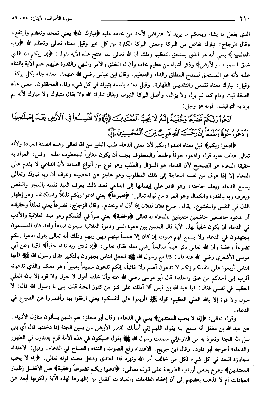 ادْعُوا رَبَّكُمْ تَضَرُّعاً وَخُفْيَةً إِنَّهُ لا يُحِبُّ الْمُعْتَدِينَ (55) وَلا تُفْسِدُوا فِي الْأَرْضِ بَعْدَ إِصْلاحِها وَادْعُوهُ خَوْفاً وَطَمَعاً إِنَّ رَحْمَتَ اللَّهِ قَرِيبٌ مِنَ الْمُحْسِنِينَ (56)