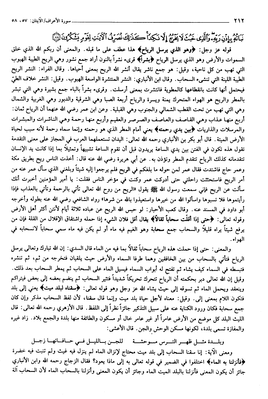 وَهُوَ الَّذِي يُرْسِلُ الرِّياحَ بُشْراً بَيْنَ يَدَيْ رَحْمَتِهِ حَتَّى إِذا أَقَلَّتْ سَحاباً ثِقالاً سُقْناهُ لِبَلَدٍ مَيِّتٍ فَأَنْزَلْنا بِهِ الْماءَ فَأَخْرَجْنا بِهِ مِنْ كُلِّ الثَّمَراتِ كَذلِكَ نُخْرِجُ الْمَوْتى لَعَلَّكُمْ تَذَكَّرُونَ (57) وَالْبَلَدُ الطَّيِّبُ يَخْرُجُ نَباتُهُ بِإِذْنِ رَبِّهِ وَالَّذِي خَبُثَ لا يَخْرُجُ إِلاَّ نَكِداً كَذلِكَ نُصَرِّفُ الْآياتِ لِقَوْمٍ يَشْكُرُونَ (58)