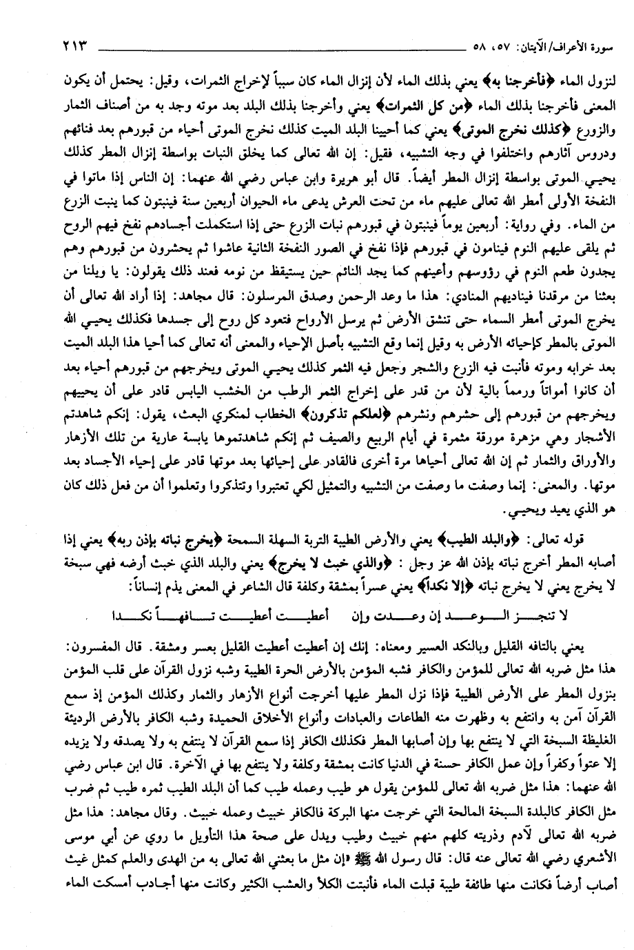 قوله تعالى: وَالْبَلَدُ الطَّيِّبُ يعني والأرض الطيبة التربة السهلة السمحة يَخْرُجُ نَباتُهُ بِإِذْنِ رَبِّهِ يعني إذا أصابه المطر أخرج نباته بإذن الله عز وجل: وَالَّذِي خَبُثَ لا يَخْرُجُ يعني والبلد الذي خبث أرضه فهي سبخة لا يخرج يعني لا يخرج نباته إِلَّا نَكِداً يعني عسرا بمشقة وكلفة قال الشاعر في المعنى يذم إنسانا: