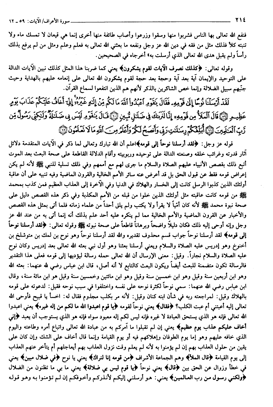 لَقَدْ أَرْسَلْنا نُوحاً إِلى قَوْمِهِ فَقالَ يا قَوْمِ اعْبُدُوا اللَّهَ ما لَكُمْ مِنْ إِلهٍ غَيْرُهُ إِنِّي أَخافُ عَلَيْكُمْ عَذابَ يَوْمٍ عَظِيمٍ (59) قالَ الْمَلَأُ مِنْ قَوْمِهِ إِنَّا لَنَراكَ فِي ضَلالٍ مُبِينٍ (60) قالَ يا قَوْمِ لَيْسَ بِي ضَلالَةٌ وَلكِنِّي رَسُولٌ مِنْ رَبِّ الْعالَمِينَ (61) أُبَلِّغُكُمْ رِسالاتِ رَبِّي وَأَنْصَحُ لَكُمْ وَأَعْلَمُ مِنَ اللَّهِ ما لا تَعْلَمُونَ (62)