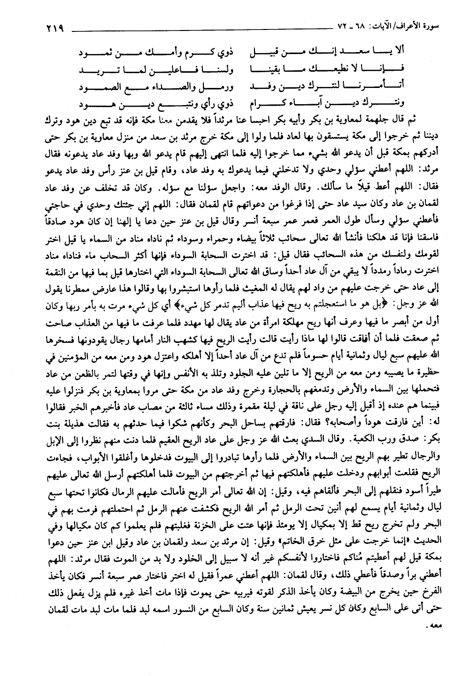ثم قال جلهمة لمعاوية بن بكر وأبيه بكر احبسا عنا مرثدا فلا يقدمن معنا مكة فإنه قد تبع دين هود وترك ديننا ثم خرجوا إلى مكة يستسقون بها لعاد فلما ولو إلى مكة خرج مرثد بن سعد من منزل معاوية بن بكر حتى أدركهم بمكة قبل أن يدعو الله بشيء مما خرجوا إليه فلما انتهى إليهم قام يدعو الله وبها وفد عاد يدعونه فقال مرثد: اللهم أعطني سؤلي وحدي ولا تدخلني فيما يدعوك به وفد عاد، وقام قيل بن عنز رأس وفد عاد يدعو فقال: اللهم أعط قيلا ما سألك. وقال الوفد معه: واجعل سؤلنا مع سؤله. وكان قد تخلف عن وفد عاد لقمان بن عاد وكان سيد عاد حتى إذا فرغوا من دعواتهم قام لقمان فقال: اللهم إني جئتك وحدي في حاجتي فأعطني سؤلي وسأل طول العمر فعمر عمر سبعة أنسر وقال قيل بن عنز حين دعا يا إلهنا إن كان هود صادقا فاسقنا فإنا قد هلكنا فأنشأ الله تعالى سحائب ثلاثا بيضاء وحمراء وسوداء ثم ناداه مناد من السماء يا قيل اختر لقومك ولنفسك من هذه السحائب فقال قيل: قد اخترت السحابة السوداء فإنها أكثر السحاب ماء فناداه مناد اخترت رمادا رمددا لا يبقي من آل عاد أحدا وساق الله تعالى السحابة السوداء التي اختارها قيل بما فيها من النقمة إلى عاد حتى خرجت عليهم من واد لهم يقال له المغيث فلما رأوها استبشروا بها وقالوا هذا عارض ممطرنا يقول الله عز وجل: بَلْ هُوَ مَا اسْتَعْجَلْتُمْ بِهِ رِيحٌ فِيها عَذابٌ أَلِيمٌ تُدَمِّرُ كُلَّ شَيْءٍ أي كل شيء مرت به بأمر ربها وكان أول من أبصر ما فيها وعرف أنها ريح مهلكة امرأة من عاد يقال لها مهدد فلما عرفت ما فيها من العذاب صاحت ثم صعقت فلما أن أفاقت قالوا لها ماذا رأيت قالت رأيت الريح فيها كشهب النار أمامها رجال يقودونها فسخرها الله عليهم سبع ليال وثمانية أيام حسوما فلم تدع من آل عاد أحدا إلا أهلكه واعتزل هود ومن معه من المؤمنين في حظيرة ما يصيبه ومن معه من الريح إلا ما تلين عليه الجلود وتلذ به الأنفس وإنها في وقتها لتمر بالظعن من عاد فتحملها بين السماء والأرض وتدمغهم بالحجارة وخرج وفد عاد من مكة حتى مروا بمعاوية بن بكر فنزلوا عليه فبينما هم عنده إذ أقبل إليه رجل على ناقة في ليلة مقمرة وذلك مساء ثالثة من مصاب عاد فأخبرهم الخبر فقالوا له: أين فارقت هودا وأصحابه؟ فقال: فارقتهم بساحل البحر وكأنهم شكوا فيما حدثهم به فقالت هذيلة بنت بكر: صدق ورب الكعبة. وقال السدي بعث الله عز وجل على عاد الريح العقيم فلما دنت منهم نظروا إلى الإبل والرجال تطير بهم الريح بين السماء والأرض فلما رأوها تبادروا إلى البيوت فدخلوها وأغلقوا الأبواب، فجاءت الريح فقلعت أبوابهم ودخلت عليهم فأهلكتهم فيها ثم أخرجتهم من البيوت فلما أهلكتهم أرسل الله تعالى عليهم طيرا أسود فنقلهم إلى البحر فألقاهم فيه، وقيل: إن الله تعالى أمر الريح فأمالت عليهم الرمال فكانوا تحتها سبع ليال وثمانية أيام يسمع لهم أنين تحت الرمل ثم أمر الله الريح فكشفت عنهم الرمل ثم احتملتهم فرمت بهم في البحر ولم تخرج ريح قط إلا بمكيال إلا يومئذ فإنها عتت على الخزنة فغلبتهم فلم يعلموا كم كان مكيالها وفي الحديث «إنما خرجت على مثل خرق الخاتم» وقيل: إن مرثد بن سعد ولقمان بن عاد وقيل ابن عنز حين دعوا بمكة قيل لهم أعطيتم مناكم فاختاروا لأنفسكم غير أنه لا سبيل إلى الخلود ولا بد من الموت فقال مرثد: اللهم أعطني برا وصدقا فأعطي ذلك، وقال لقمان: اللهم أعطني عمرا فقيل له اختر فاختار عمر سبعة أنسر فكان يأخذ الفرخ حين يخرج من البيضة وكان يأخذ الذكر لقوته فيربيه حتى يموت فإذا مات أخذ غيره فلم يزل يفعل ذلك حتى أتى على السابع وكان كل نسر يعيش ثمانين سنة وكان السابع من النسور اسمه لبد فلما مات لبد مات لقمان معه.