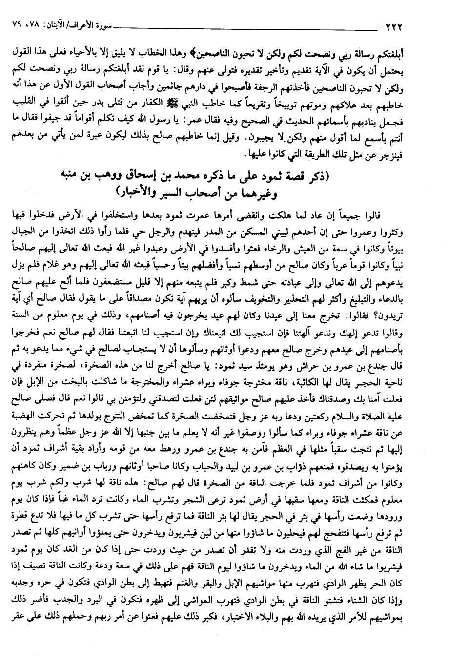 أَبْلَغْتُكُمْ رِسالَةَ رَبِّي وَنَصَحْتُ لَكُمْ وَلكِنْ لا تُحِبُّونَ النَّاصِحِينَ وهذا الخطاب لا يليق إلا بالأحياء فعلى هذا القول يحتمل أن يكون في الآية تقديم وتأخير تقديره فتولى عنهم وقال: يا قوم لقد أبلغتكم رسالة ربي ونصحت لكم ولكن لا تحبون الناصحين فأخذتهم الرجفة فأصبحوا في دارهم جاثمين وأجاب أصحاب القول الأول عن هذا أنه خاطبهم بعد هلاكهم وموتهم توبيخا وتقريعا كما خاطب النبي صلى الله عليه وسلم الكفار من قتلى بدر حين ألقوا في القليب فجعل يناديهم بأسمائهم الحديث في الصحيح وفيه فقال عمر: يا رسول الله كيف تكلم أقواما قد جيفوا فقال ما أنتم بأسمع لما أقول منهم ولكن لا يجيبون. وقيل إنما خاطبهم صالح بذلك ليكون عبرة لمن يأتي من بعدهم فينزجر عن مثل تلك الطريقة التي كانوا عليها.